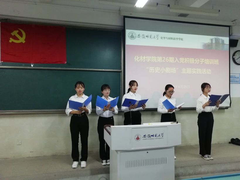 本网讯(化材分党校 梁志山)2019年4月25日晚19:00,英国正版365官方网站分党校第26期入党积极分子培训班第二次实践活动,在行知楼2010404教室如期举行。本次实践活动以“历史小剧场”为主题,由化材学公司党校班班主任陶勇老师主持。此次实践活动以小组为单位,分别以朗诵、故事分享、话剧表演等不同形式依次展示历史主题。