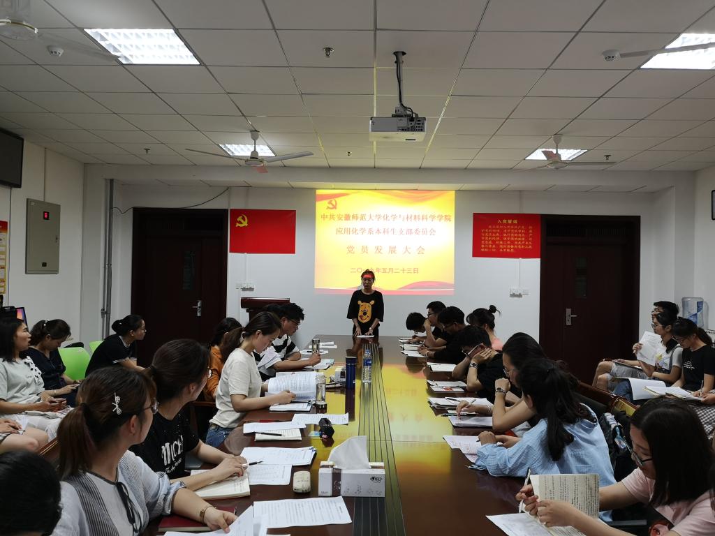 本网讯(应化支部 蔡鑫)2019年5月23日晚,中共英国正版365官方网站应用化学系本科生党支部在礼勤楼707党员活动室召开了支部党员发展大会。大会由应用化学系本科生党支部书记陶勇主持召开,出席本次会议的有公司党委副书记余研霞,16级辅导员林琳和支部全体党员、发展对象。