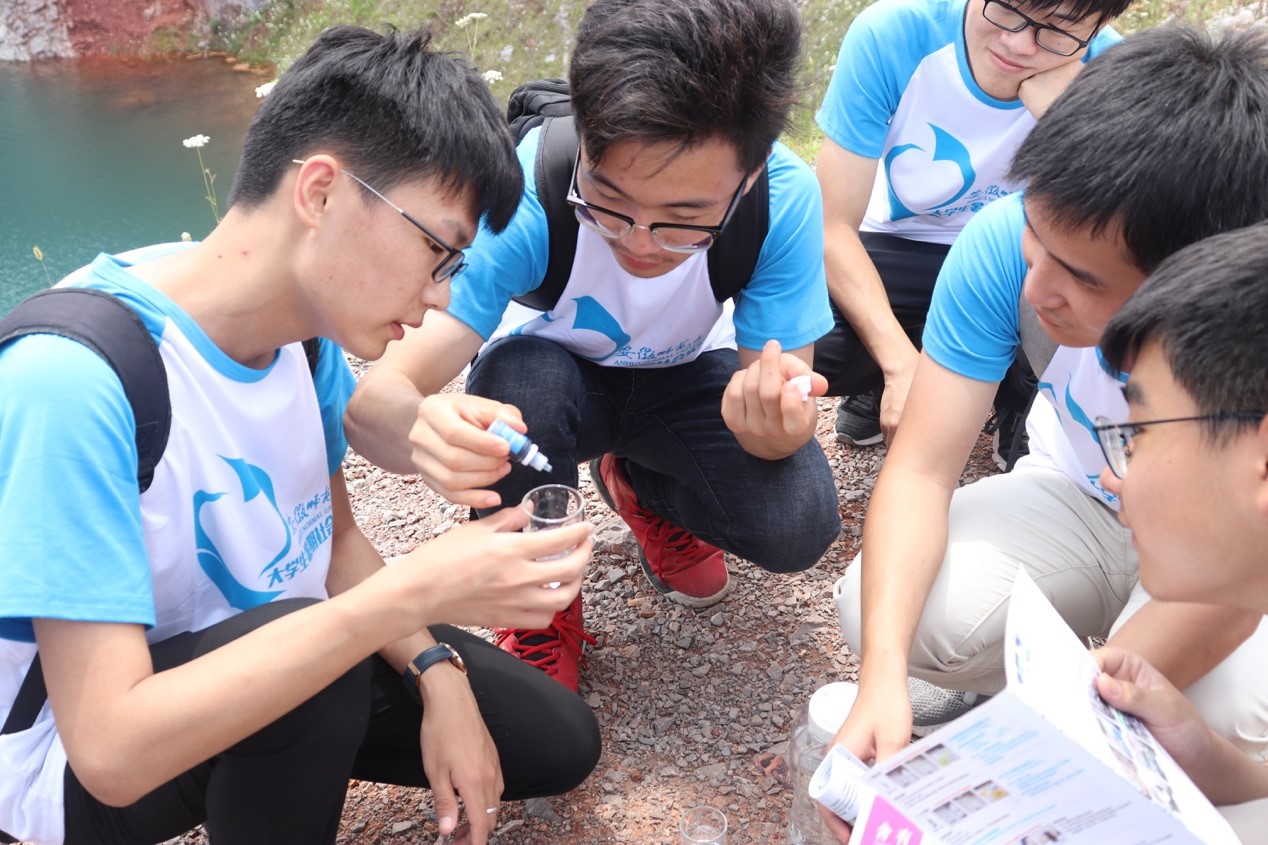 实践成员们对水样进行了多种检测,通过对水样酸碱性的检测,得出蓝色网红湖湖水pH值在8左右,成员们对这个结果也做出了一定的评价,由于天气原因,之前下过雨,成员估计这是pH值较低的原因。第二个实验是对水样硬度的检测,通过加入检测试剂,观察水样颜色的改变,从而判断水样的硬度,实验结果表明,水的硬度较大,且水中钙离子含量较高。第三个实验是对水样活性的检测,检测结果:水样为活性。最后一个实验是对与水样中是否含有重金属的检测,初步判断出水样中含有铜离子的结论。初步实验在湖旁已经完成,下一步,成员们会带着分析结果进入实验室和有关部门,深入分析蓝色湖成因。