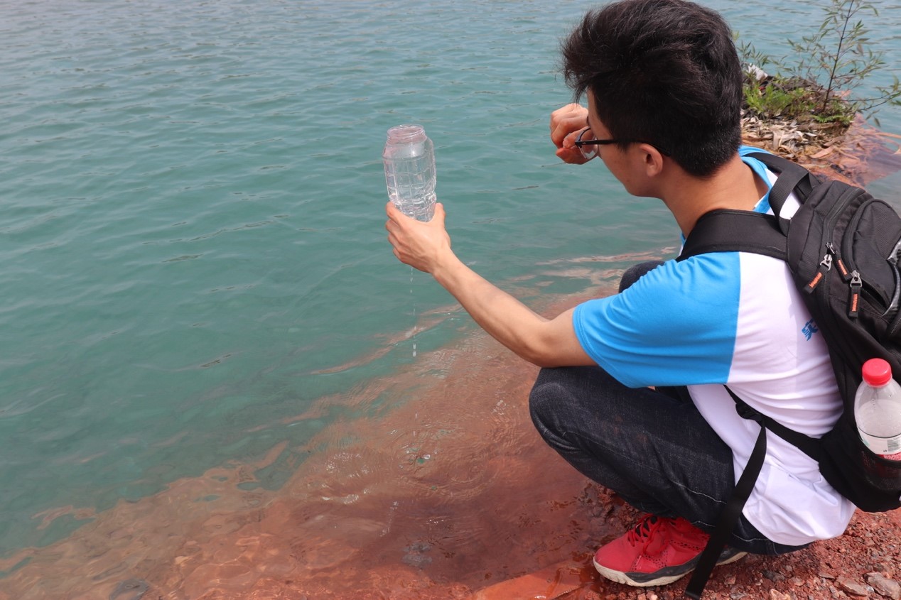 抵达蓝色网红湖后,实践团队的成员们便积极开展了各种工作。首先,成员们对网红湖的湖水进行了采样,成员们前往河边一同进行了水样的采集,由于采样当天之前几天下过雨,为了确保后期检测的可靠性,尽量选取了较深处的水样。网红湖地形较为陡峭,采样完毕后,大家便返回了湖边的平地,运用携带的实验材料进行初步实验检测。