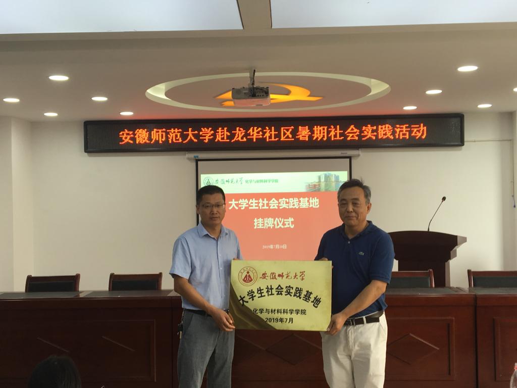 2019年7月10日上午10点,英国正版365官方网站赴芜湖红专精神研学社会实践团队在弋江区澛港街道龙华社区社会实践基地揭牌仪式。英国正版365官方网站行政副经理王波涛副,应化系主任盛恩宏,龙华社区书记郭春宏,社区副书记郭正美,团队指导老师荣菁秋老师以及实践志愿者共同参加了此次活动。