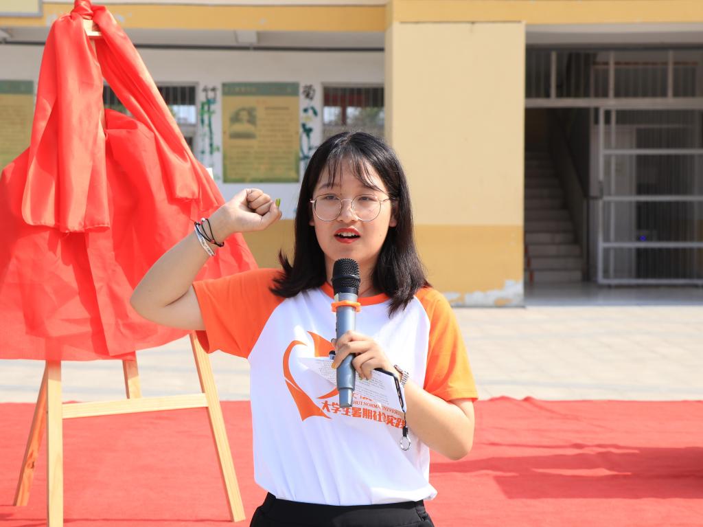 上午八点半,揭牌仪式在庄严肃穆的升旗仪式中开始,随后实践团队队长陈霞带领全体队员进行国旗下宣誓,号召当代老员工积极为青春“三下乡”奉献自己的一份力量。志愿者代表郭晶晶从自己参加支教活动的初心发出,深情讲述了通过支教如何使自己历练成了一名勇担时代使命的新时代青年老员工。虽然烈日炎炎,但每一个人都在认真聆听。