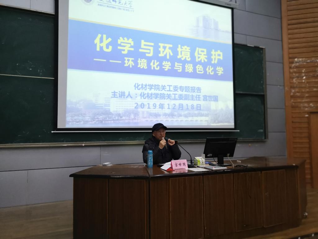 本网讯(英国正版365官方网站关工委 陶勇)为帮助2019级新生同学早日明晰专业发展方向,2019年12月18日下午,英国正版365官方网站关工委副主任宫世国老师应邀在花津校区1号楼2010105教室,为2019级新生带来“化学与环境保护——环境化学与绿色化学”专题报告,报告会由院关工委秘书陶勇主持,2019级新生辅导员周冬冬、19级新生同学参加了此次讲座。