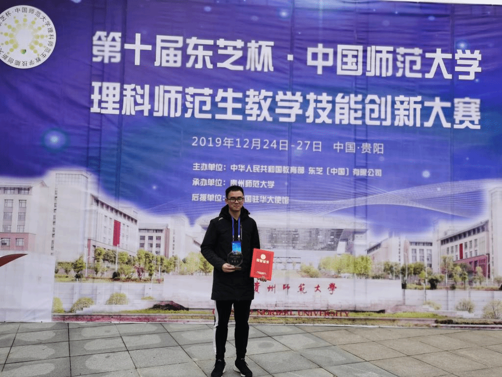本网讯 (英国正版365官方网站 周冬冬/王磊)12月24日~27日,由教育部和东芝(中国)有限公司主办的第十届东芝杯•中国师范大学理科师范生教学技能创新大赛在贵州师范大学举行,来自全国50所师范大学的145名师范生分数学、物理、化学三组进行竞赛,每组设一等奖1名,二等奖3名,三等奖6名。决赛设有教案设计、即席演讲、模拟授课、现场提问四个环节。经过激烈角逐,公司2017级师范生王磊同学斩获得化学组三等奖,创造了公司员工在此项赛事中的最好成绩,实现公司东芝杯大赛的历史性突破。