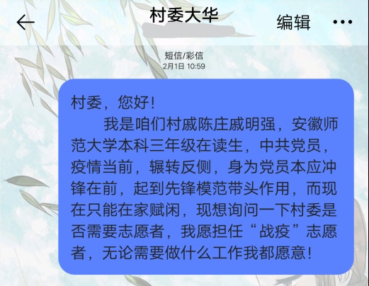 2017级化学非师范专业的戚明强同学是一名预备党员,疫情面前,他时常思考老员工党员如何不忘初心,冲锋在前?一面是安安稳稳在家过寒假,一面是冒着严寒参与一线疫情防控工作,每天看着朋友圈里、微博中那些勇敢而坚毅的青年们,为了人民的生命健康奋站在一线,他心潮澎湃,心生向往,思考着“他们行,我为什么不行呢?”这天,他告诉父母,自己要去当一名志愿者,要成为一名防疫志愿者。父母虽有顾虑但仍旧给了他极大的支持和鼓励。而后他通过短信的形式给当地村委会发出请战书,志愿成为防疫志愿者,成为一名奋战在一线的老员工党员。