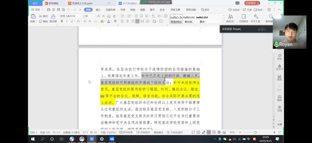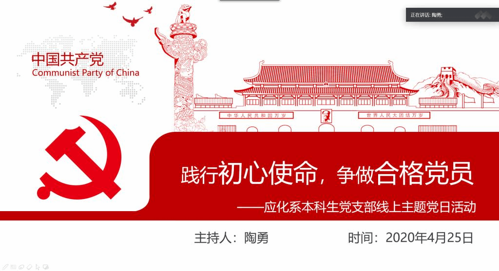 本网讯(应化系党支部 陶勇/胡倩倩)为增强疫情期间党员教育管理,确保支部组织活动正常进行,4月25日20:00,应化系本科生党支部召开线上支部大会暨主题党日活动,支部全体党员参加会议,此次会议由支部书记陶勇老师主持。