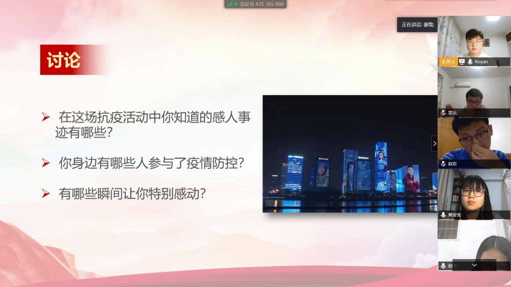 支部党员谢骜也和大家分享了他参与一线工作的感受。受母亲的影响以及看到这么多人为了这次疫情做出的牺牲,他积极报名参加了志愿活动,参加了社区的消毒、辖区卡点等工作。通过这次志愿活动,他深深地感受到中华民族是一个伟大的民族,也感受到了当代老员工的时代责任。支部其他成员张凡、赵宁、刘子豪等也发表了自己的看法与感悟。