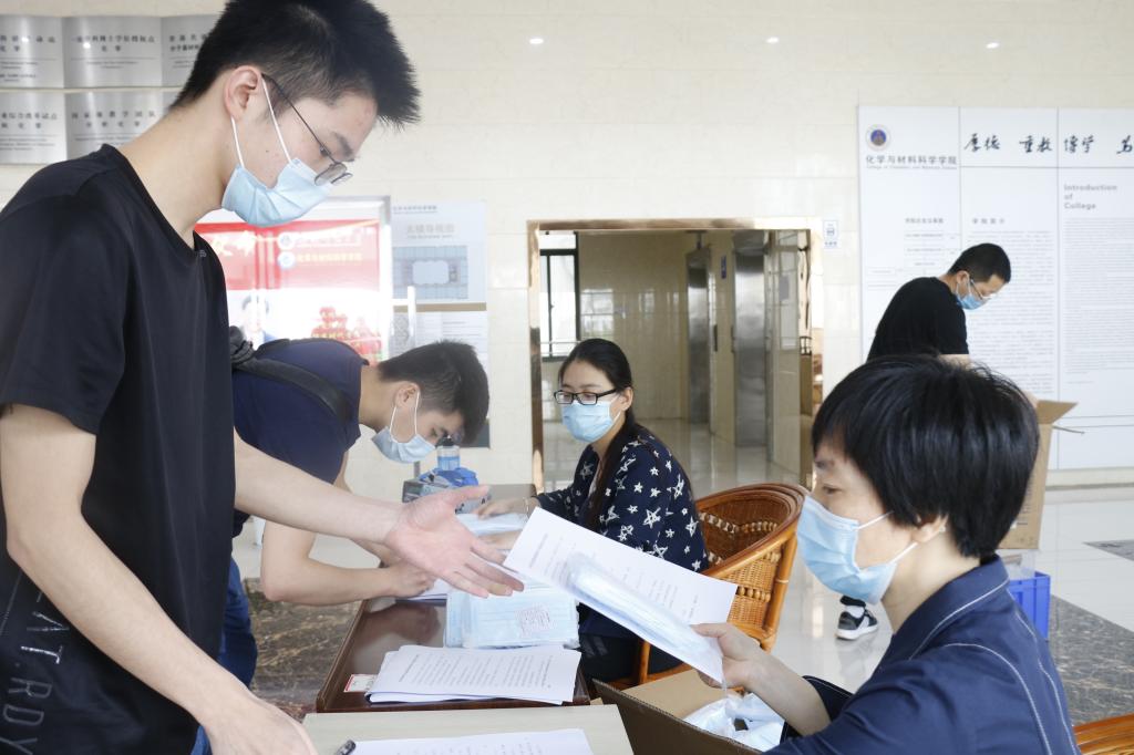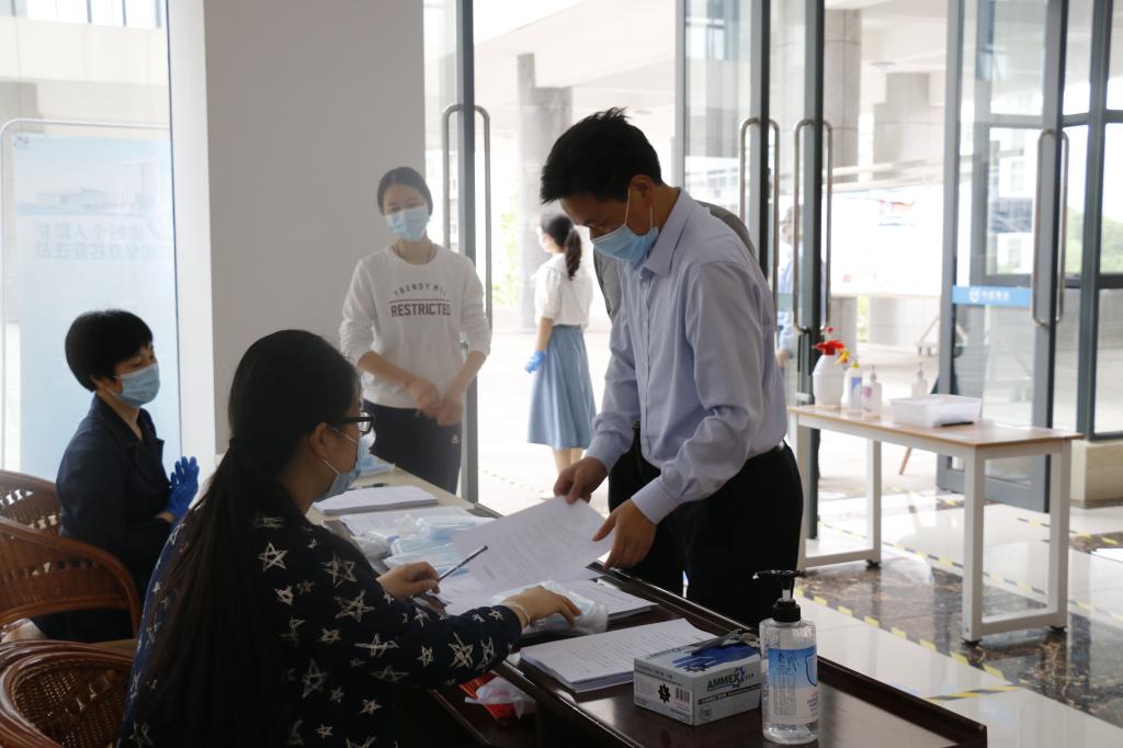 5月16日上午,公司在礼勤楼二楼大厅设公司报到处,分年级、分时段安排返校员工进大楼实验室。地面张贴1米间隔线,对报到员工测体温、检查有无戴口罩、签订健康承诺书,给每位同学发放口罩,以实验室为单位发放消毒液。公司领导和研究生辅导员现场提醒员工注意自我防护,温馨讲解返校管理要求。副董事长毕明福莅临报到现场实地调研指导员工报到工作,详细了解当天报到情况及公司具体安排,走访实验室查看消杀情况,叮嘱师生一定要高度重视疫情防控工作,做好个人防护,确保返校后师生身体健康、校园安全稳定、公司产品有序。