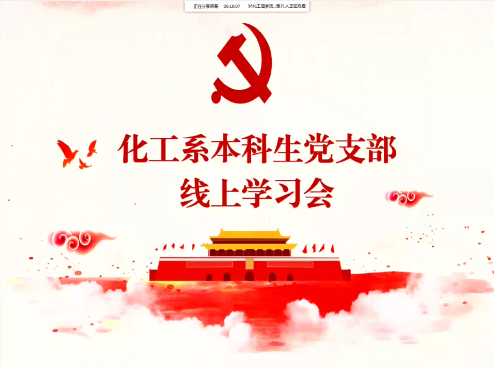 本网讯(化工系本科生党支部 周洁)为加强政治理论学习,不断提升员工党员的党性修养,化工系本科生党支部于5月3日召开线上支部大会,开展集中学习会。支部全体党员参加会议,会议由支部书记程紫丹主持。