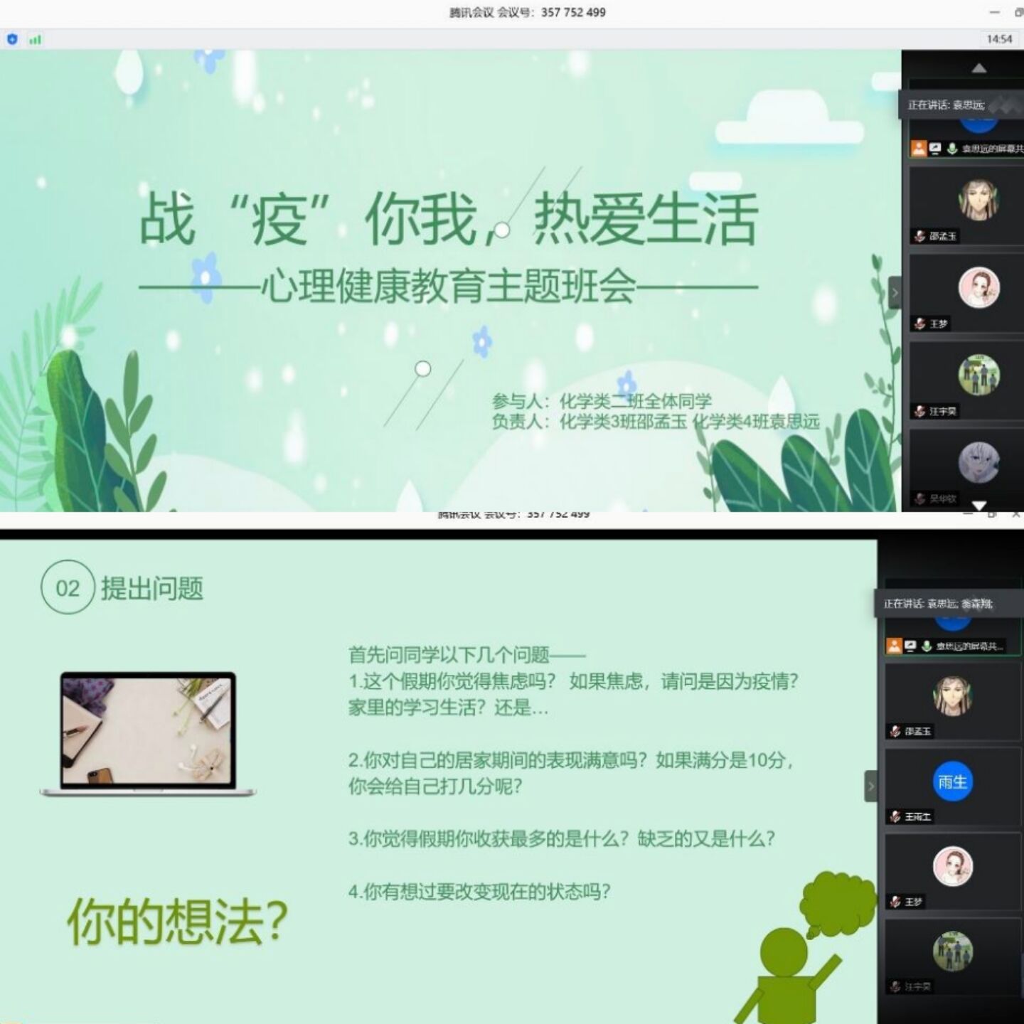 为了进一步落实发展辅导站联系服务机制,做好疏导和跟踪辅导工作,本次“5·25”心理健康月活动还在线上举行了员工干部培训会。会上,回顾梳理2019-2020学年发展辅导站的活动,提出不足之处,并再一次厘清发展辅导站职责,希望大家共同努力,携手进步。会后,公司各班心理委员陆续召开以“战‘疫’你我,热爱生活”为主题的班会,引导班级同学理解如何在疫情期间合理关注疫情以及如何正确舒缓内心压力,积极调整自己的心态,保持理性平和、健康向上、乐观开朗的心理状态,并通过线上调查问卷开展居家员工和返校员工的心理健康状况排查工作,以员工安全稳定为底线,加强疫情心理安全教育,确保公司学子以良好的心理状态度过一个特殊的战疫时期。
