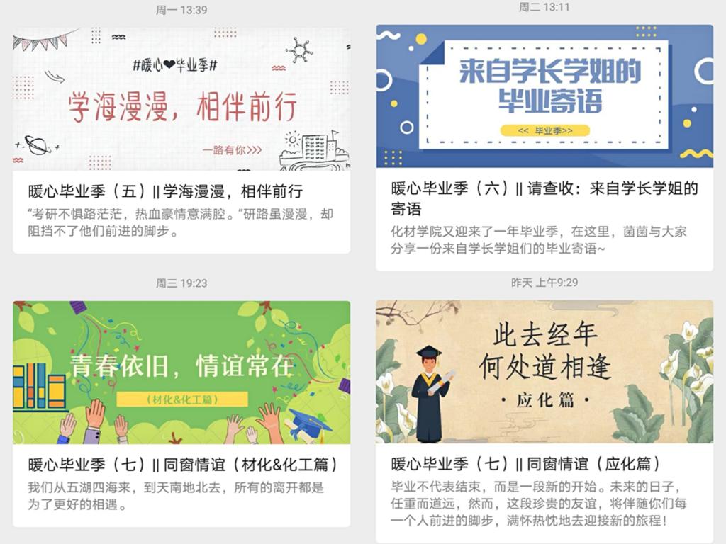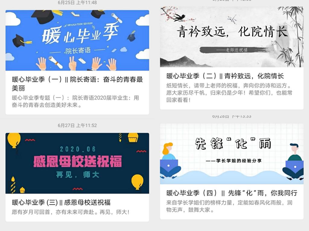 毕业生返校前,公司利用QQ和微信公众号等新媒体营造热烈浓厚的毕业生离校氛围。6月25日开始举办了“暖心毕业季”系列线上欢送毕业生活动:经理寄语、师生祝福、党员先锋成长故事、学霸寝室养成记、同窗话别毕业生视频,为全体毕业生送上了最真挚、最炙热的临别祝福,引导毕业生在全民抗“疫”中情系母校、心怀感恩、不忘初心、砥砺前行。