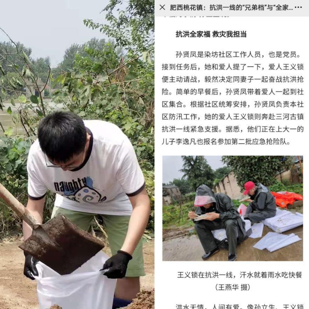 英国正版365官方网站团员青年紧随党员步伐,志愿参与守护堤坝。2019级化学类李逸凡在其党员母亲的影响下,他坚定的报名参加了当地第二批应急抢险队,和家人共同奋战在防汛前线。“党旗所指即为团旗所向,我身为团员要紧随党员的步伐,守护好大堤,为家乡出一份力。”2019级化学非师范王睿说道。自防汛工作开始,王睿就主动参与其中,学习如何巡堤,如何寻找管涌现象,如何做好跑筹工作等,用志愿者的力量践行作为团员的责任与担当。天灾无情人有情,2019级化学工程与工艺郝乐存也积极参与到防汛工作当中,他表示,自己虽然不能像军队官兵一样走向抗洪抢险最前线,但仍认真做好寻堤防查、巡视记录等基础抗洪工作,用青春热情贡献出作为化材学子的一份力量,用实际行动致敬战斗在防洪前线的每一位英雄。