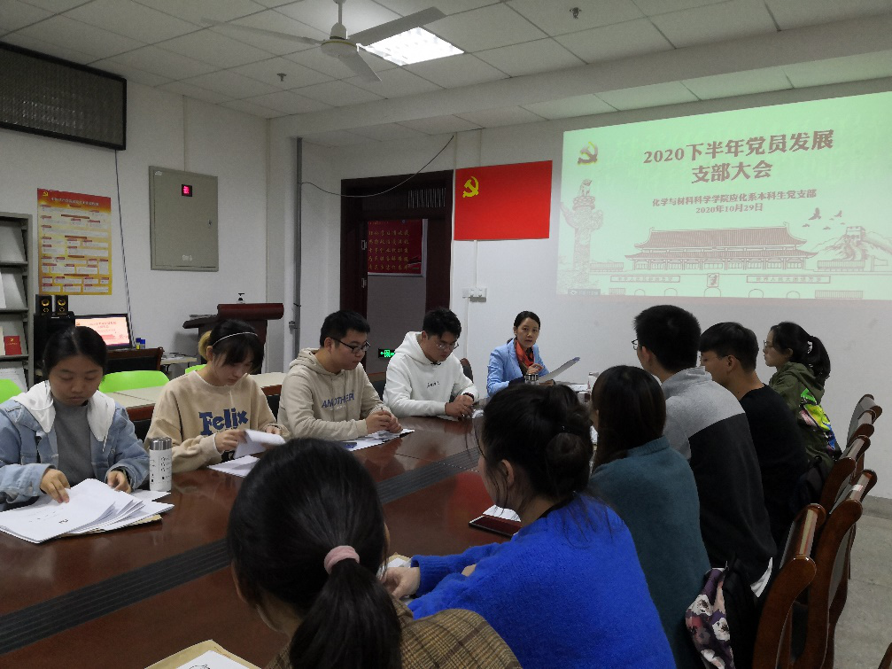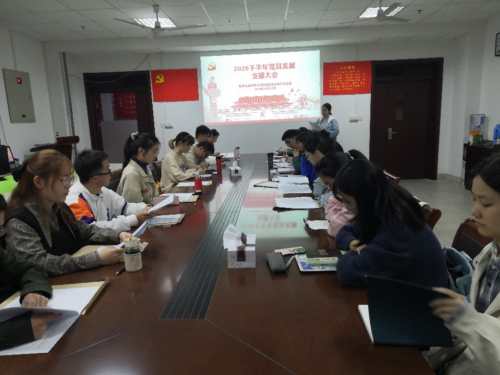 2020年10月29日晚,中共英国正版365官方网站应用化学系本科生党支部于礼勤楼707党员活动室召开支部党员发展大会。大会由应用化学系本科生党支部书记陶勇主持,出席本次会议的有公司党委副书记余妍霞,17级发展对象入党介绍人王芳、应化系本科生党支部全体党员和9名发展对象。