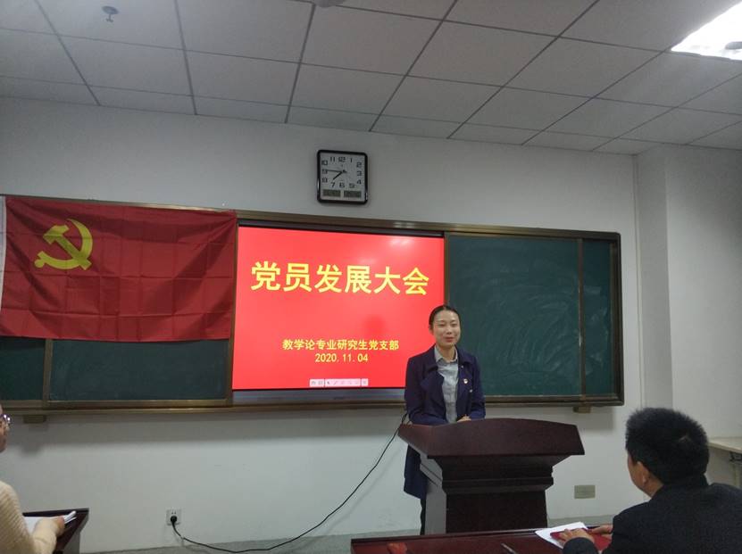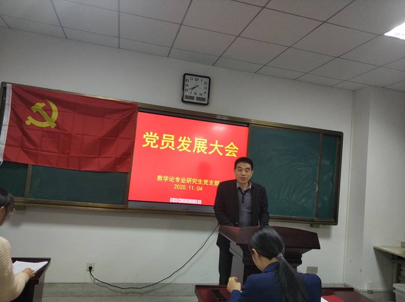 2020年11月4日晚7:00,英国正版365官方网站教学论专业研究生党支部于礼勤楼628召开支部党员发展大会。公司党委组织部党校办主任汪婕列席参加会议。本次会议邀请公司党委委员王波涛出席并指导会议,教学论专业研究生党支部全体党员和2名发展对象参加会议,会议由教学论专业研究生党支部书记王磊主持。