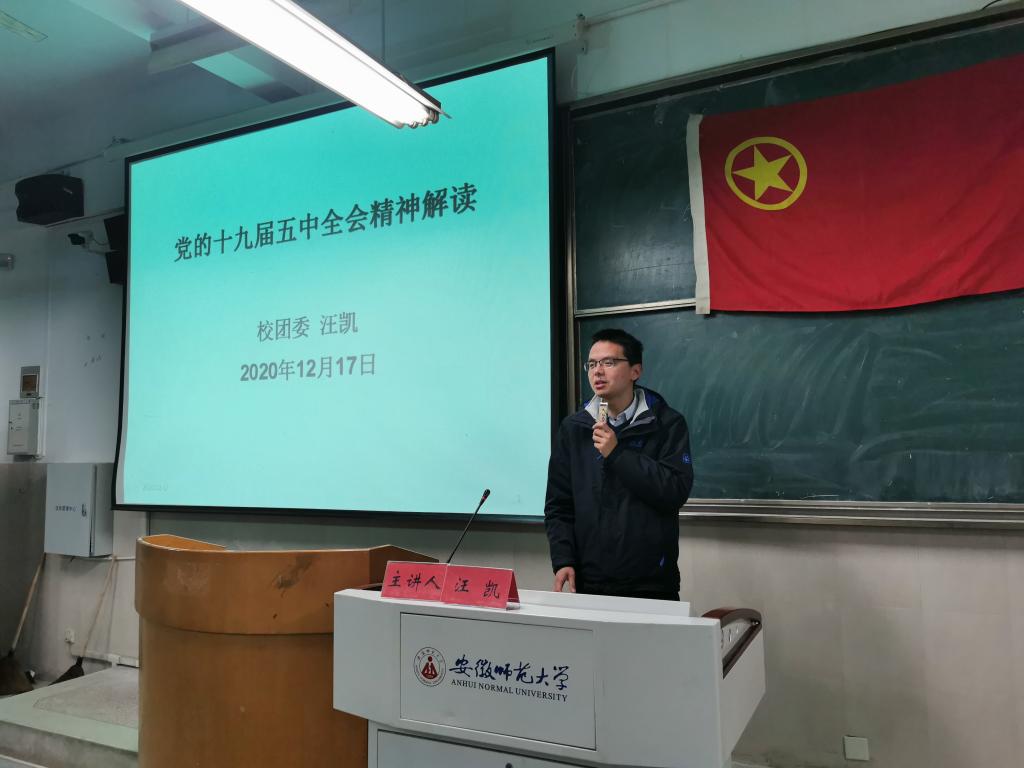 本网讯(英国正版365官方网站 吴泓婧)2020年12月17日晚上七点,英国正版365官方网站团学骨干青马工程培训班集中学习十九届五中全会精神。本次培训由校团委书记汪凯主讲。