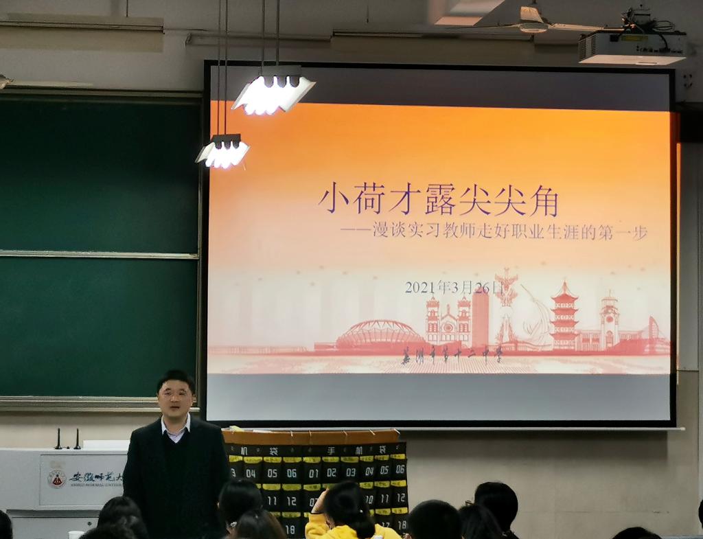 严增进老师围绕“融合核心素养的高中化学新教材”对高中化学新教材(必修)进行了详细的解析,通过新教材中“元素及其化合物”与“基本概念和原理”穿插编排的结构特点的讲解,可以看出新版教材对老版教材的继承、发展和创新,即分散了学习难度又符合学习规律,他希望2018级化学专业师范生要尽快熟悉新教材。陈波老师围绕“小荷才露尖尖角——漫谈实习教师走好职业生涯的第一步”主题,从教育实习的目的和功能入手,强调了教育实习的必要性。他指出在教育实习中应及时做好身份转换与角色变化,尽快熟悉实习公司的作息时间与管理规定,融入实习班级。最后,陈波老师用“坚定的职业向往、匹配的个性气质、扎实的专业基础、敏锐的洞察能力、高超的沟通技巧”总结了教师的特征,期待员工的完美蜕变。两位老师的报告从一线教学实际出发,内容充实,语言生动幽默,为即将到来的教育实习指明了方向。