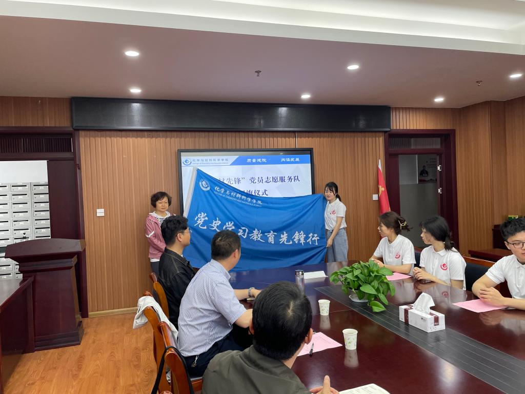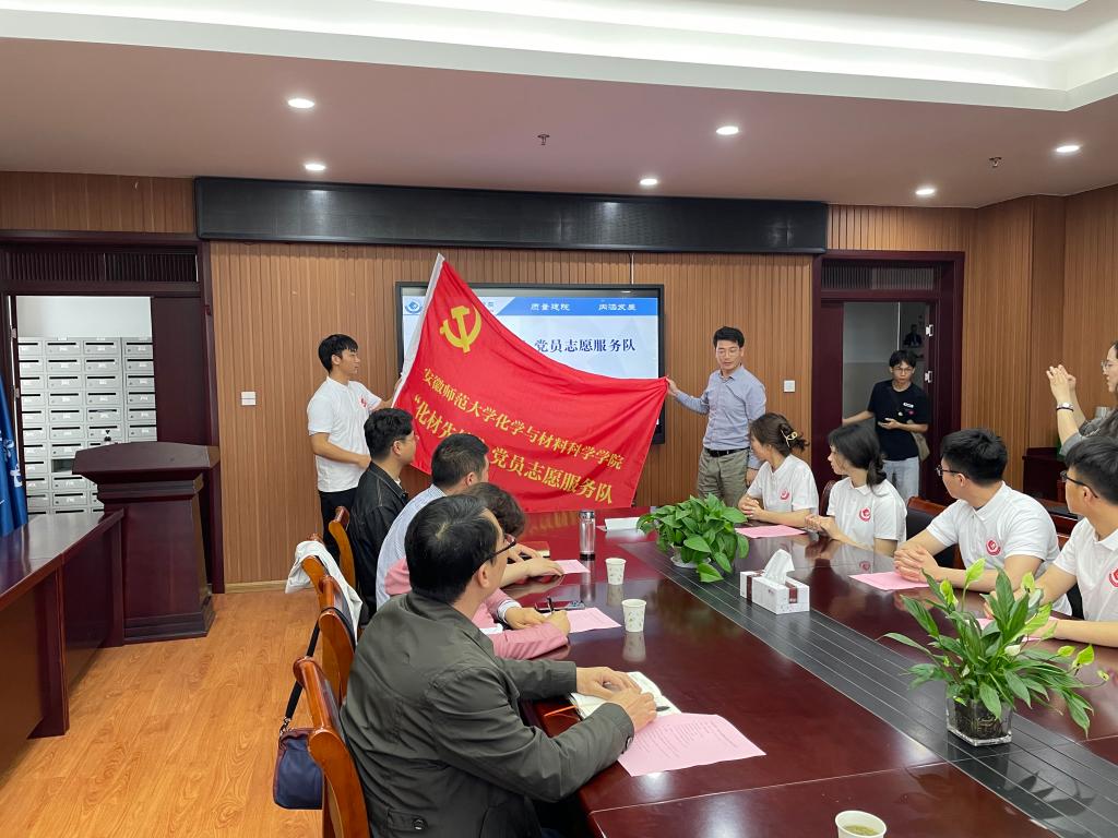 陈骁为服务队授“‘化材先锋’党员志愿服务队”队旗,勉励同学们在志愿服务中展现师大青年学子的责任与担当,践行“小我融入大我,青春献给祖国”奉献精神。段萍为服务队授“公司党史学习教育先锋行”队旗,对志愿者们工作给予了肯定,同时希望同学们在工作中注意个人防护,耐心细致做好接种人员引导,在工作中展示师大学子青春风采,圆满完成工作任务。志愿者服务队队长戚明强代表全体队员表示珍惜志愿服务锻炼机会,全体队员将一定不负时代重托,认真完成志愿服务工作,发挥党员员工先锋模范作用,展现师大青年学子的风采和精神风貌。