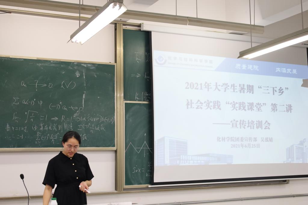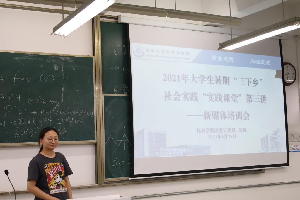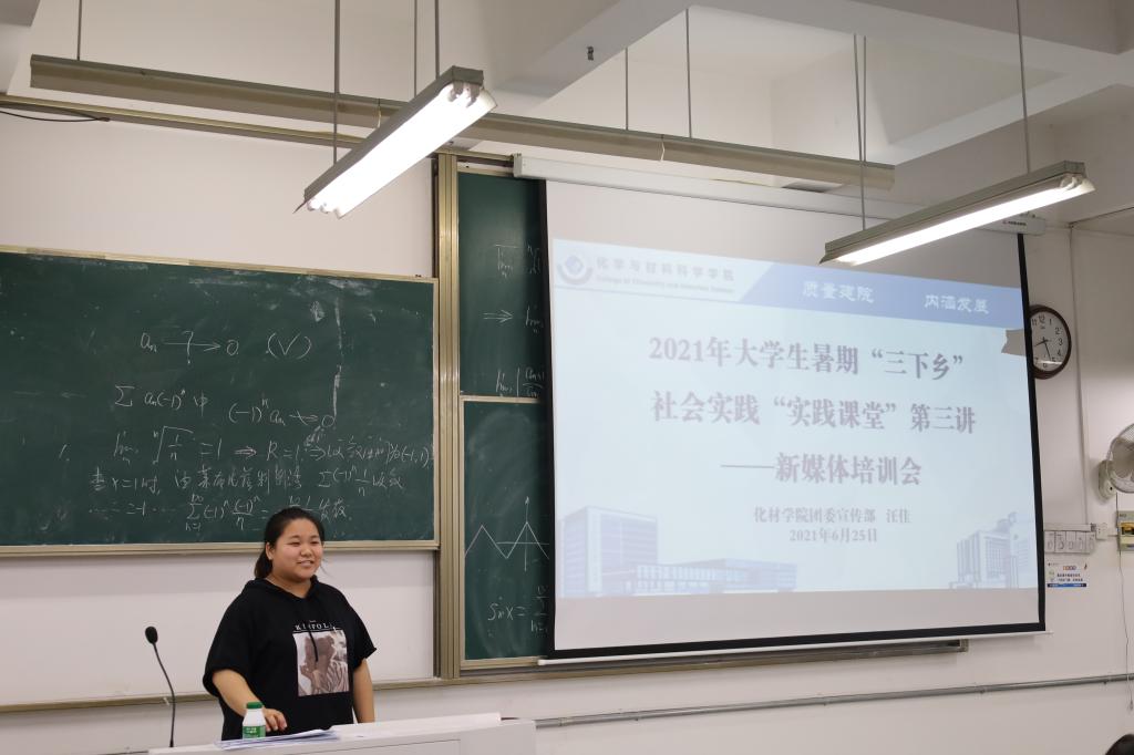 陶勇老师首先介绍了开展暑期社会实践活动的意义,结合往年宣传经验、通讯稿投稿量和新媒体平台运营情况,强调了宣传工作在暑期社会实践活动中的重要性。随后,公司员工会主席、2020年暑期社会实践优秀个人郭晶晶同各队宣传员分享了通讯稿的投稿经验,并介绍了投稿所需的注意事项。团委宣传部部长吴泓婧则从新闻稿的撰写入手,将通讯稿的文字撰写、图片拍摄和格式要求进行了说明。团委宣传委员汪佳和团委宣传部副部长薛源介绍了QQ、微信两大新媒体平台的运营方法,并详细介绍了说说图文动态、微信公众号推文的制作方法。与此同时,此次培训会也向各队宣传员公布了校级重点团队、院级重点团队和班级团队的宣传指标,并布置了实践过程中宣传日报的具体工作时段和工作要求。