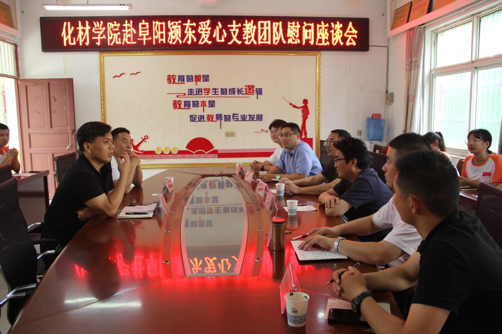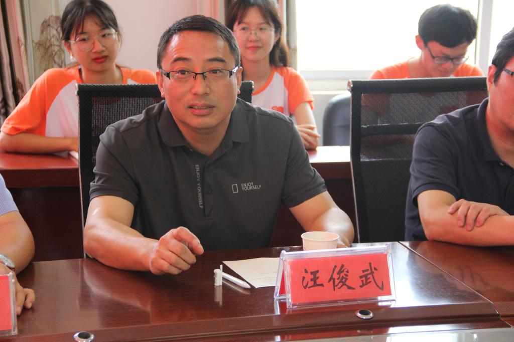 20日上午,汪俊武一行来到阜阳市颖东区新乌江镇亲切慰问了“化”雨润芽,“材”风为蕾爱心支教暑期社会实践团队,并召开师生座谈会与志愿者们进行深入交流,新乌江镇中心公司董事长周凯、副董事长戴宗刚及暑期社会实践队员代表共同出席了本次座谈会。