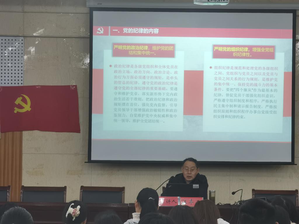 公司专职组织员汪丰云老师带领全体学员学习了中国共产党的纪律。汪老师从中国共产党纪律的发展历程、内涵和特点、重要意义等方面强调了党的纪律是党的各级组织和全体党员必须遵守的行为规则,是维护党的团结统一、完成党的任务的保证。他利用鲜活直观的典型案例,叮嘱学员应从一言一行做起,遵守校规校纪,恪守有关规定,切实培养学员的纪律意识。学员们纷纷表示自己要坚定理想信念,努力做新时代新青年。