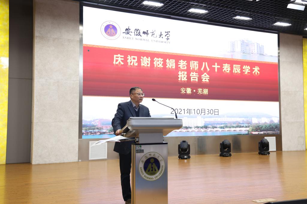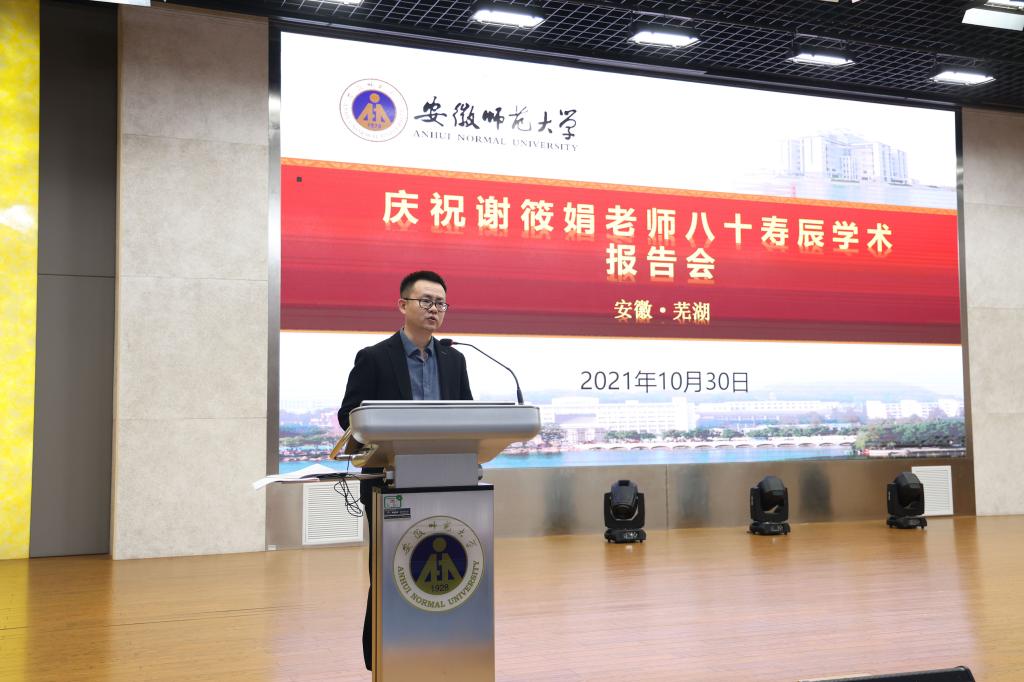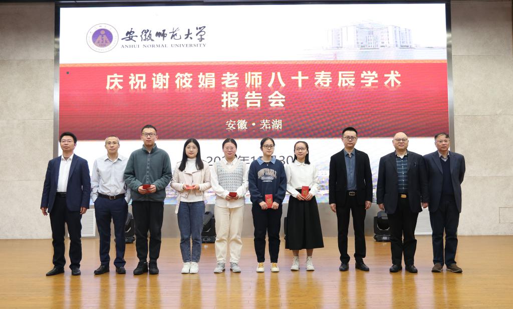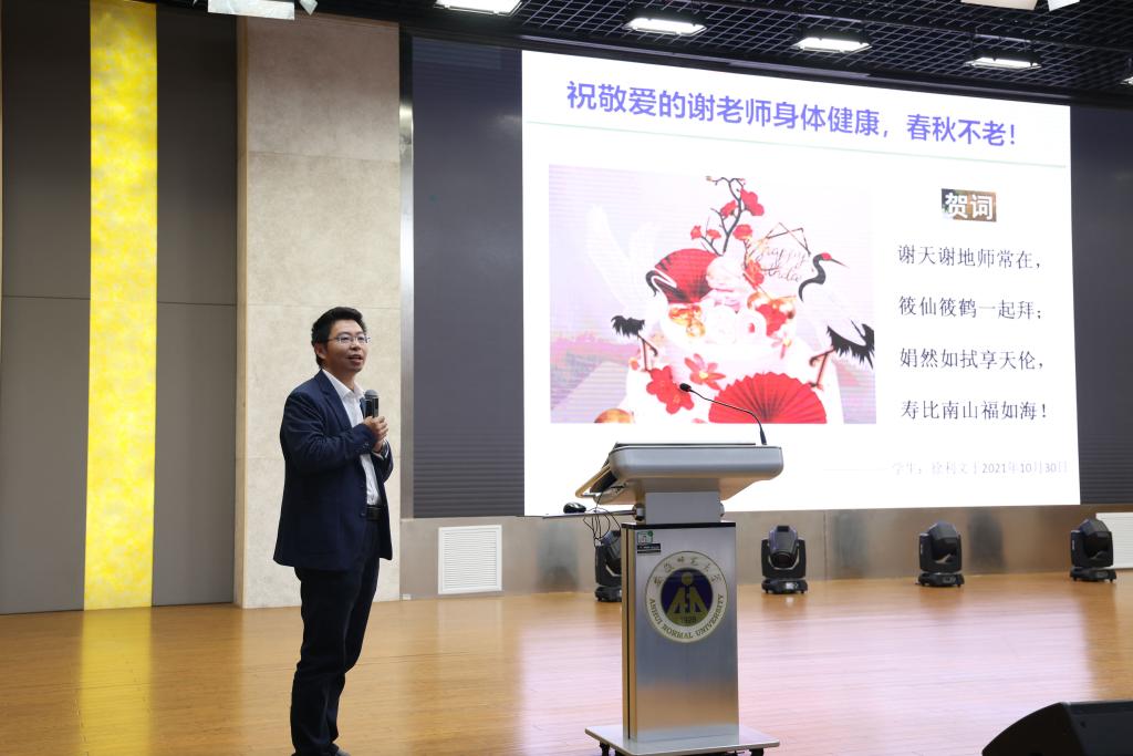 专家学术报告会由“功能分子固体”教育部重点实验室副主任郝二红主持。汪志勇教授作了题为《电化学催化的有机反应》的报告,介绍了课题组在该领域的代表性工作成果;刘心元教师分享了《手性阴离子-铜催化不对称交叉偶联反应》的报告,介绍了课题组在该领域的系列工作;徐利文教授作题为《Precise Evolution of Multifunctional Chiral P-ligands for the Enantioselective Construction of Carbon/Silicon-stereogenic Centers》的报告,并深情朗诵了一首自己创作的贺词:谢天谢地师常在,筱仙筱鹤一起拜。娟然如拭享天伦,寿比南山福如海。