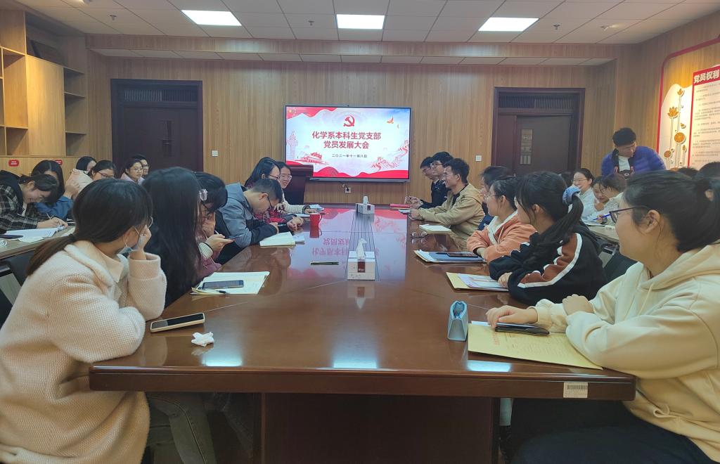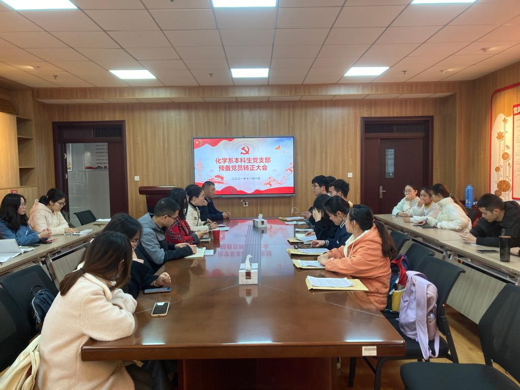 本网讯(化学系本科生党支部 张思雨)11月8日下午,化学系本科生党支部在礼勤楼707室召开了2021年下半年发展党员及党员转正大会。本次大会由化学系本科生党支部书记陈静主持,辅导员程紫丹、王霞及全体党员参加此次会议,公司党委副书记李古州列席会议指导。大会讨论接受程子妍等3名同志为中共预备党员,以及预备期满的徐千千等6名同志如期转正的相关事宜。