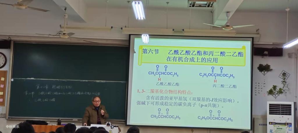 孙老师课前以幽默风趣的语言向本次课程观摩老师表示欢迎。在新课开始前,孙老师使用多媒体以及板书的方式带领同学们回顾了上节课的主要内容,并邀请同学们回答上节课布置的两个问题,紧接着又向大家介绍了本堂课中两种重要的有机物——乙酰乙酸乙酯和丙二酸二乙酯。孙老师从结构特点、乙酰乙酸乙酯和丙二酸二乙酯的各种反应以及反应条件、注意点等方面具体阐述了二者的性质,紧紧围绕反应式向同学们介绍乙酰乙酸乙酯和丙二酸二乙酯在有机合成上的应用,通过一系列理论知识以及例题讲述,深入浅出,层层递进。孙老师联系以往所学过的知识,将旧知识融会贯通于新知识中,向大家例举有机合成中常见的官能团引入、逆合成法等问题。本次公开课上,孙老师授课语言生动诙谐,知识点分析到位,切实做到了让同学们积极投入到课堂学习。