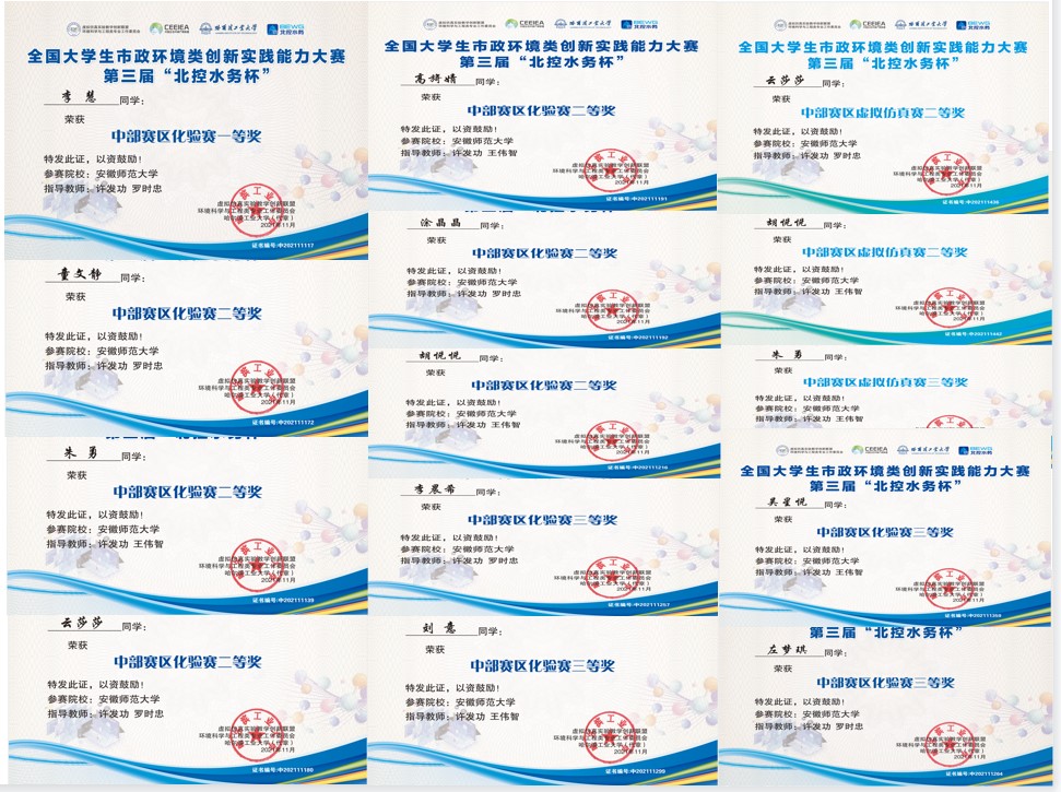 全国老员工市政环境类创新实践能力第三届“北控水务杯”大赛分为地区选拔赛、决赛。地区选拔赛竞赛内容包含化验赛和虚拟仿真赛,地区选拔赛为线上选拔。其中化验赛为重铬酸钾法测定水中化学需氧量,采用视频录制的方式展开,即将实验全过程视频剪辑成不超过5min的短视频;虚拟仿真赛包括“水污染控制工程”和“水质检测”两类虚拟仿真赛项。公司对此高度重视,认真准备,最终取得优秀成绩。其中,李慧同学获得化验赛一等奖,胡悦悦、高旖婧、朱勇、涂晶晶、童文静、云莎莎同学获得化验赛二等奖,刘意、吴星悦、李晨希、左梦琪同学获得化验赛三等奖,胡悦悦、云莎莎同学获虚拟仿真赛二等奖,朱勇同学获虚拟仿真赛三等奖。许发功、罗时忠、王伟智三位老师获优秀指导教师称号。许发功,罗时忠分别荣获全国老员工市政环境类创新实践能力第二届、第三届“北控水务杯”金牌裁判称号。