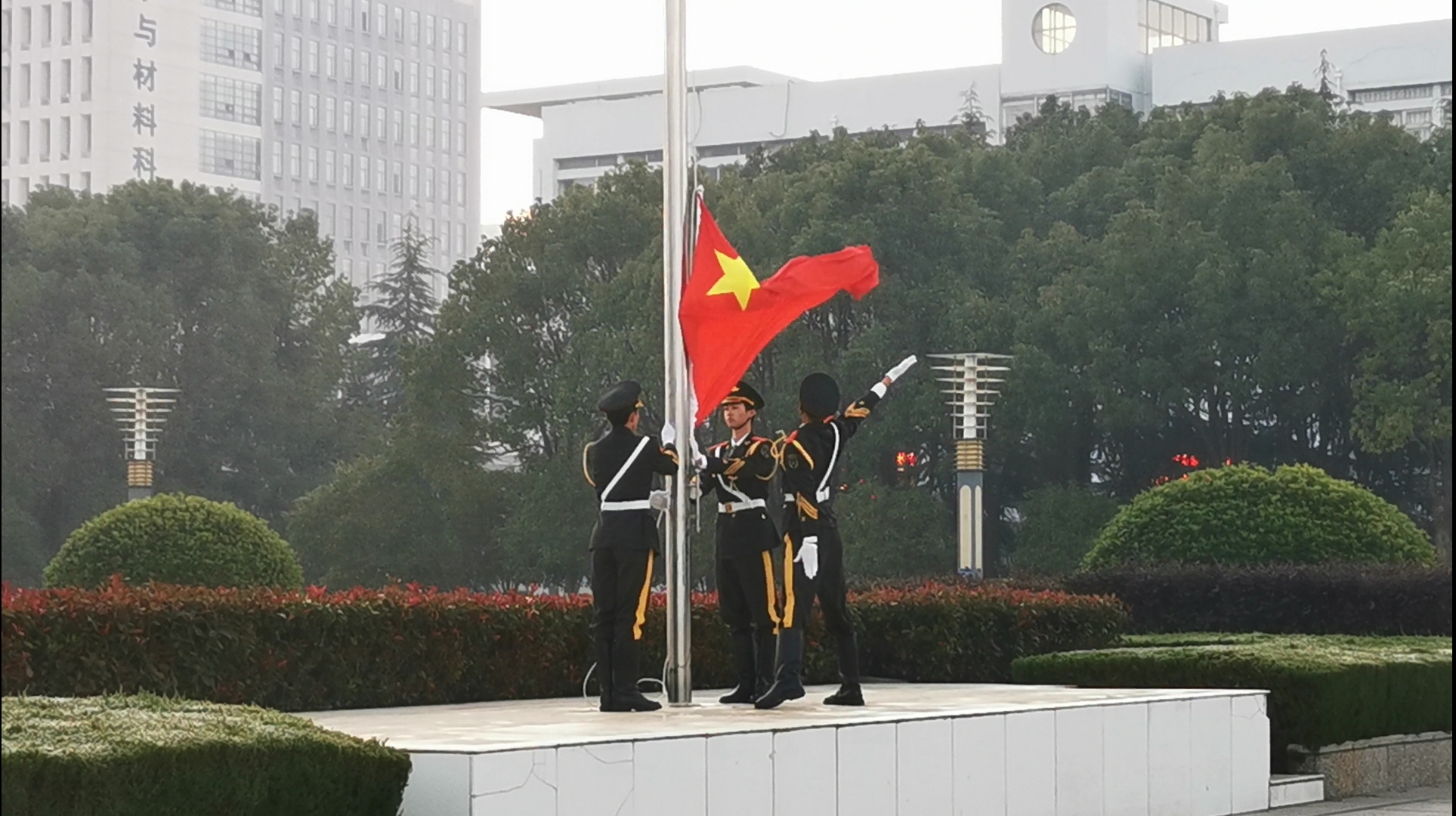 迎着朝阳,国旗护卫队的旗手们迈着铿锵的步伐,以饱满的热情,庄严地护卫五星红旗进场。在激昂的《义勇军进行曲》中,升旗手振臂一挥,鲜艳的五星红旗冉冉升起,全体师生向国旗行注目礼。