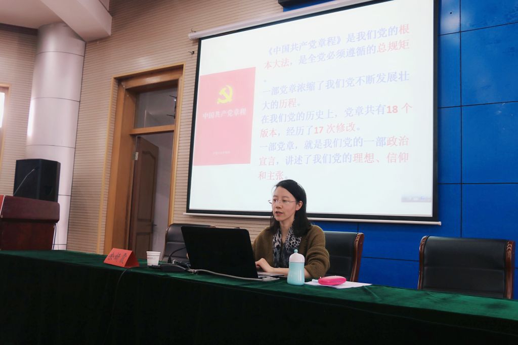 学党章,正动机。公司党委组织部副部长余妍霞作《学党章、悟思想、正动机》的专题报告。她通过“讲故事——看视频——记笔记”的方式讲述了六位先进共产党人用生命守卫信仰、用忠诚维护党章尊严,用热血践行使命和初心的感人事迹。随后,余部长详细介绍了党章的历史沿革和主要内容,重点谈及了十九大党章修改的重要内容。她要求同学们,生在祖国发展最好的时代,要深刻领会到党章的深刻内涵,坚守共产党人的初心和使命,按照党员标准严格要求自己。