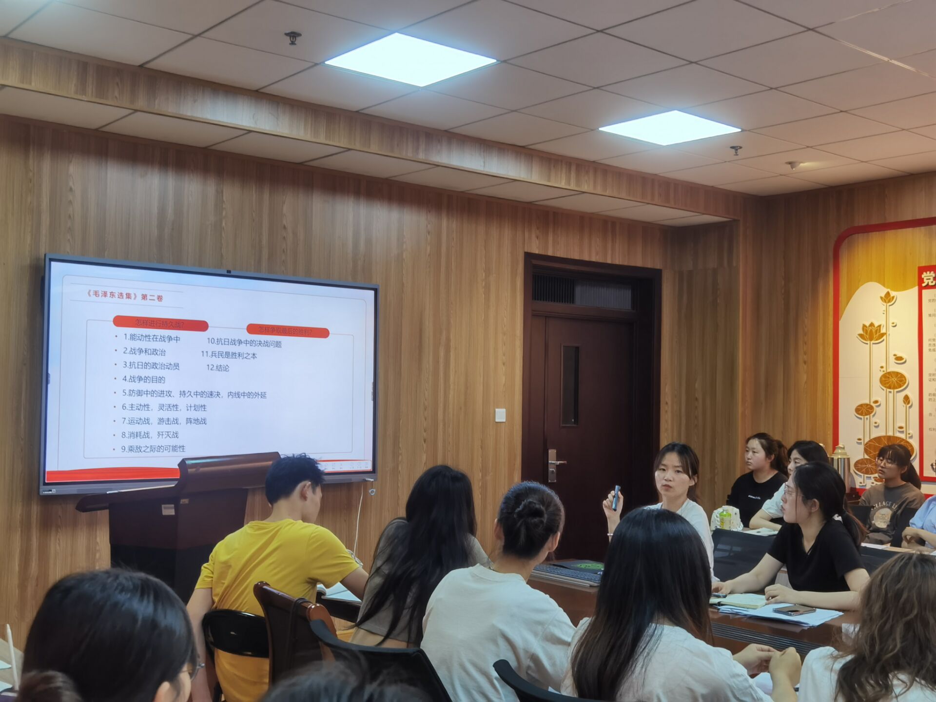 政治专题学习,锤炼过硬本领。会议的第二项是党支部副书记付娜老师带领大家开展了党员读书学习分享交流会。会上,付娜老师首先对《论持久战》毛泽东选集第二卷的大体内容进行了概括,并带领全体党员进一步学习了这篇毛泽东演讲稿的背景和主要内容。并将主要内容分为两个部分:前9个问题主要聚焦于抗日战争的胜利终将属于中国;后12个问题则讲述了抗日战争如何取得胜利的问题。“《论持久战》以超拔的哲学思维将‘持久战’这一军事概念理论化、系统化、具体化、实践化,它批驳了错误论调,坚定了中国民众的抗战信心,是指导抗战胜利的有力思想武器。其中,依靠和动员人民群众的相关论断至今读来仍然具有强烈的现实价值”,付娜老师如是说。