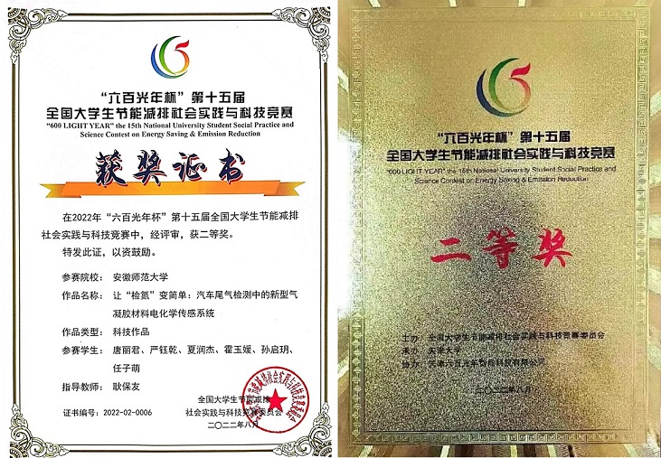 由耿保友教授指导,英国正版365官方网站唐丽君、严钰乾、夏润杰、霍玉媛、孙启玥、任子萌等同学的项目《让‘检氮’变简单:汽车尾气检测中的新型气凝胶材料电化学传感系统》,获得全国二等奖。