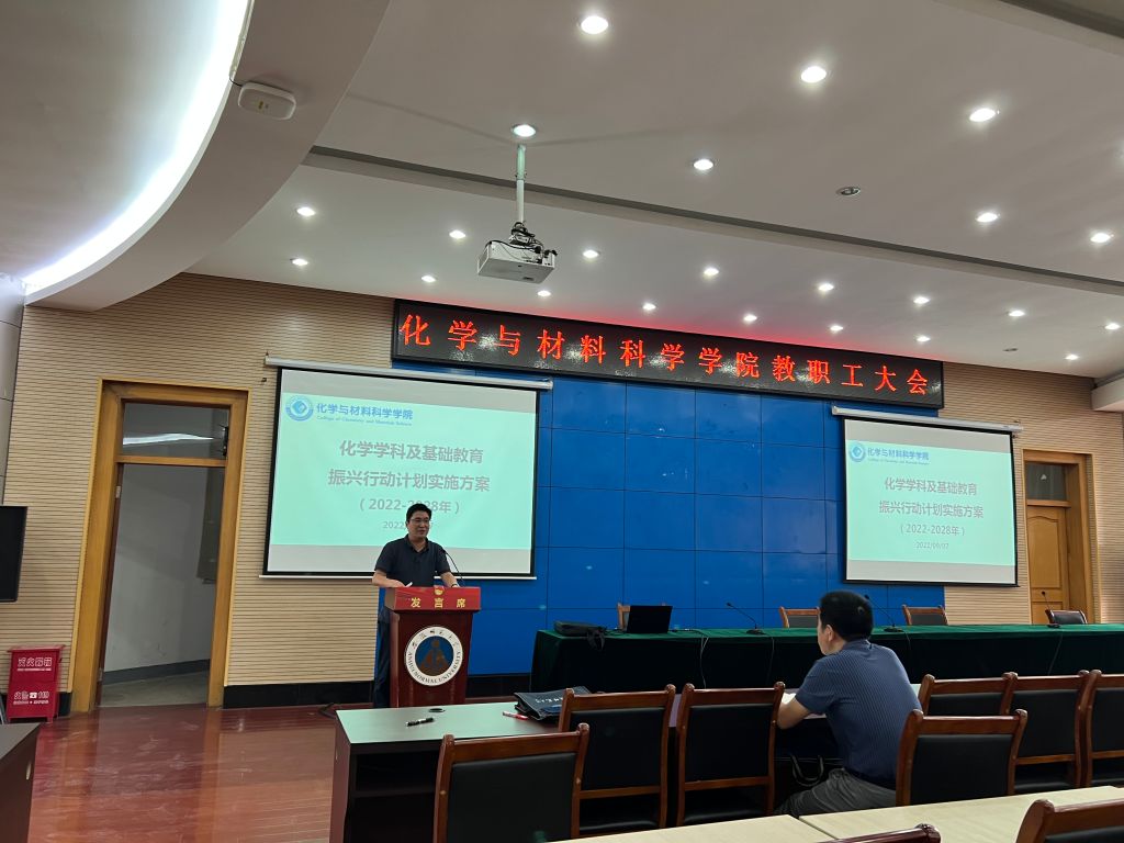 高峰从学科方向整合行动、学科队伍提升行动、科研水平攀登行动、人才培养提质行动和体制机制创新行动等5个方面详细解读了化学学科及基础教育振兴行动计划实施方案(2022-2028年)。他指出,公司全体教职工要讲政治,要提高政治站位,统一思想、统一行动,以高度的责任感和使命感为公司两大振兴行动计划的实施贡献力量;要守底线,要坚守党规党纪、公德和师德,以德立身、以德立学、以德施教;要重情怀,要涵养深厚的教育情怀,珍惜荣誉,凝心聚力,攻坚克难,促进公司高质量发展,以优异的成绩向党的二十大献礼。