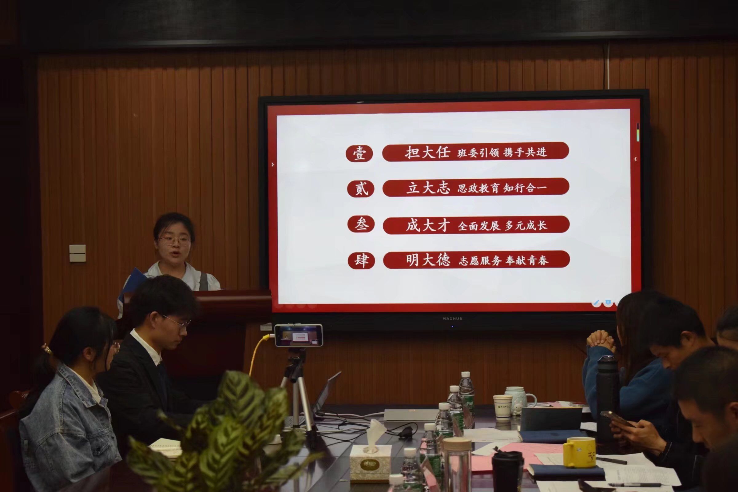 汇报中,各参评班级汇报人根据抽签顺序,结合视频、ppt等形式详细介绍了班级在组织建设、思想引领、学风建设、基础文明等方面的优秀做法与典型成效,个人的演讲与台上的演示充分融合,从不同视角对集体所做的所有工作进行全面总结,全方面展示了班级的基本情况。