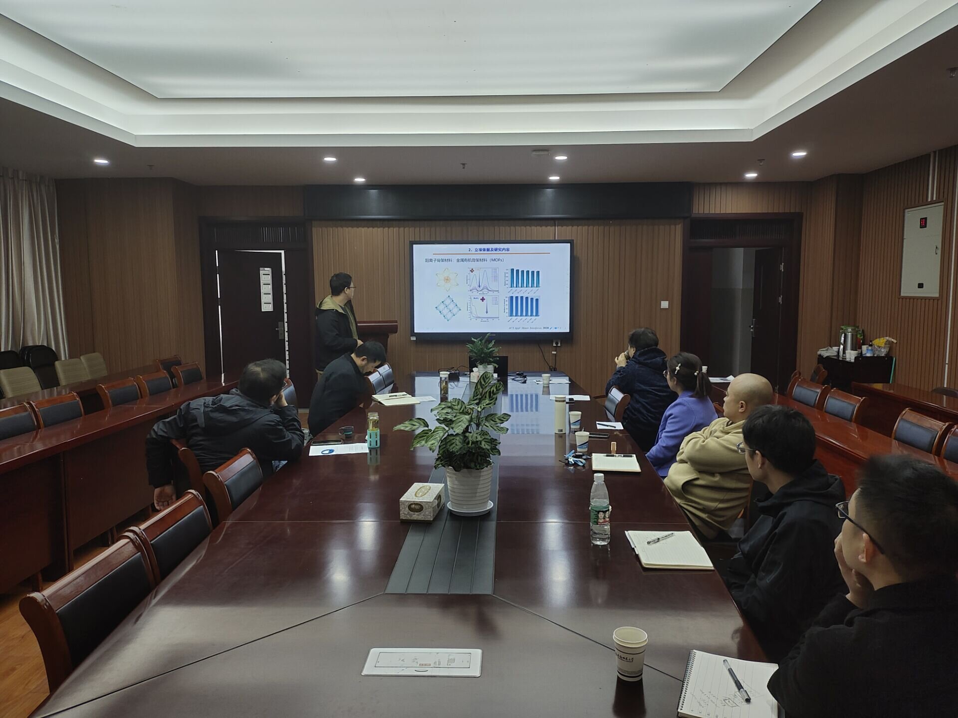 程永峰、陈曙光、张修都、岳艳、孙键、方姣姣、傅聪、王新、梁俊等九位教师分别作了题为“自由基参与的二醇的分子间不对称去对称化反应研究”、“廉价过渡金属催化烯烃与脂肪羧酸NHP酯的Csp3-Csp3不对称脱羧还原偶联研究”、“瓜环基轮烷框架材料的构筑及其对含氧阴离子的吸附”、“金属Salphen-共价有机框架的制备及电催化应用”、“氮杂环卡宾-镍、钯硅基烃基配合物的合成及反应性研究”、“异质结负载单原子光催化小分子活化反应研究”、“氧化钛基模型催化剂光催化甲烷和二氧化碳“表面位点-表面物种对”精细构筑及其表面光化学研究”、“太阳能蒸发制备洁净水中的跨尺度热质输运问题的研究”、“非季铵型吡啶衍生物结构导向剂合成分子筛催化新材料”的基金选题汇报。分别从选题背景、国内外研究现状、个人科研背景和拟申报项目主要研究内容等方面介绍了将要申请项目的情况。