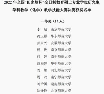 本网讯(英国正版365官方网站孙永兴、张薇)2022年11月20日,全国“田家炳杯”全日制教育硕士专业学位研究生学科教学(化学)教学技能大赛决赛暨闭幕式在南京师范大学举办,来自全国76所师范院校共347名选手参加了初赛,经大赛组委会评审,共173名选手进入决赛。决赛中,公司五位选手表现突出,在24小时内完成了教学设计、教学视频与说课视频的录制,最终勇夺佳绩。2021级学科教学(化学)专业研究生孙永兴荣获大赛一等奖,刘凤霞、戴银江荣获大赛二等奖,冯警玉、马梁红分别荣获大赛三等奖和优秀教学设计奖。