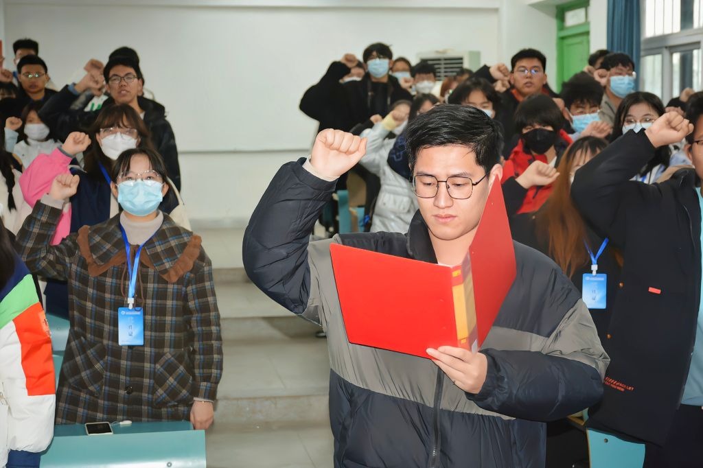 上午,伴随着庄严的国歌声,换届大会拉开了序幕。团委副书记陶勇老师为2021届团委员工会工作人员代表颁发聘书和礼品。随后,团委书记梅冠东、辅导员吴钰濛、张浩依次为新任团委、员工会主席团、部长及部员代表颁发工作证和工作手册并合影留念。主席团成员陈功洋发表了就职演讲,他说道:“我们新一届团委、员工会全体成员得到了许多宝贵经验和莫大的鼓励,也感受到更大的压力,意味着我们即将迎来更多的机遇和更大的挑战。”随后,2022届团委、员工会全体工作人员签署了《入职宣誓书》,并在团委员工会主席团成员胡博带领下庄严宣誓。