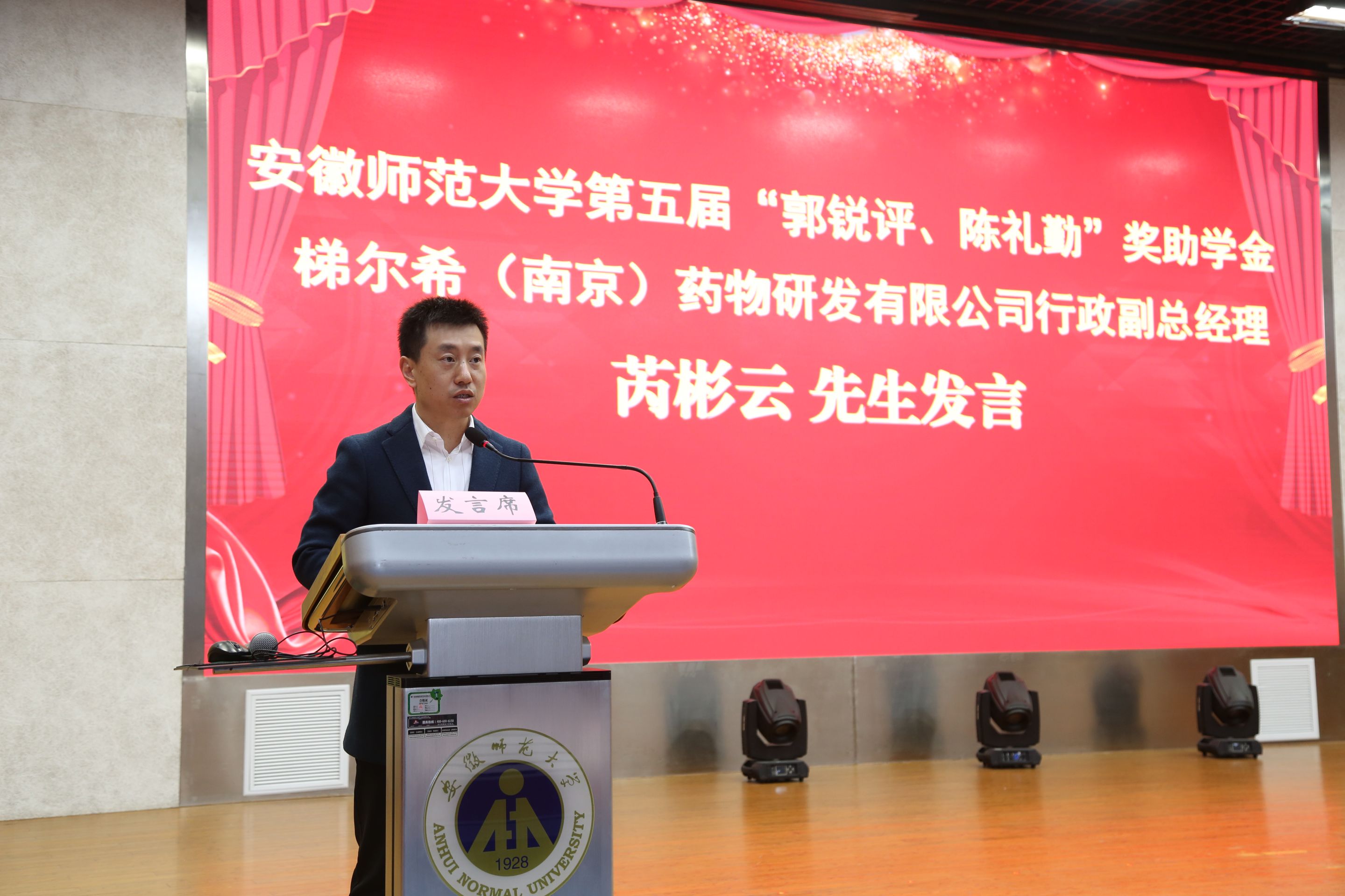 王如意老师代表公司教育基金会向梯尔希(南京)药物研发有限公司芮彬云先生一行表示热烈欢迎,向获奖、受助的同学表示热烈的祝贺。他指出,“员工是母校靓丽的名片”,母校的建设与发展得到了员工们的广泛关注,得益于员工们的大力支持。他寄语广大青年员工:要不负青春,做一位有志气的新时代青年,志存高远、胸怀天下,厚植家国情怀,树立为祖国和人民永久奋斗、赤诚奉献的远大理想,立志做有理想、敢担当、能吃苦、肯奋斗的新时代好青年。要不负韶华,做一位有骨气的新时代青年,始终保持热爱学习、勤于奋斗的本色,主动适应公司培养一流人才的目标和要求,积极为公司“两大振兴行动计划”增添力量。要不负时代,做一位有底气的新时代青年,对未来早作规划、设立目标,重视课内外实践训练,关注学科前沿和未来发展,做到融会贯通、厚积薄发,让青春在党和人民需要的地方绽放绚丽之花。