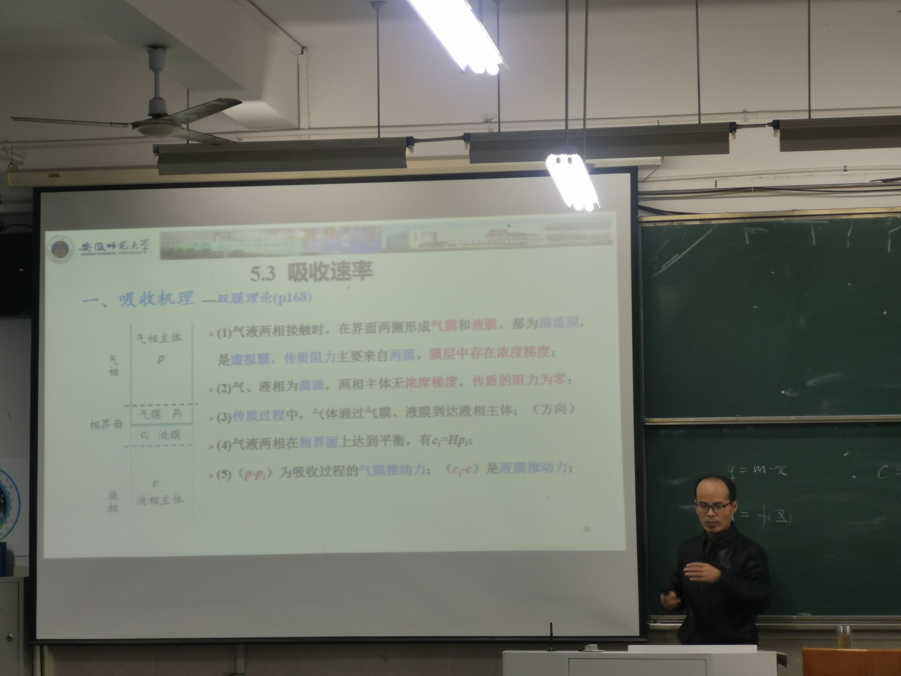 随后,许发功老师紧接双膜理论基础论点,向大家介绍了分子扩散定律以及扩散现象,以PPT图例以及公式推导向同学们介绍菲克定律以及吸收速率方程。许发功老师娓娓道来,生动活泼地讲解了以上原理,同学们激情饱满。课堂氛围良好,同学认真听讲、思维活跃。课后老师们对本次公开课给予了高度评价并进行了点评与交流。