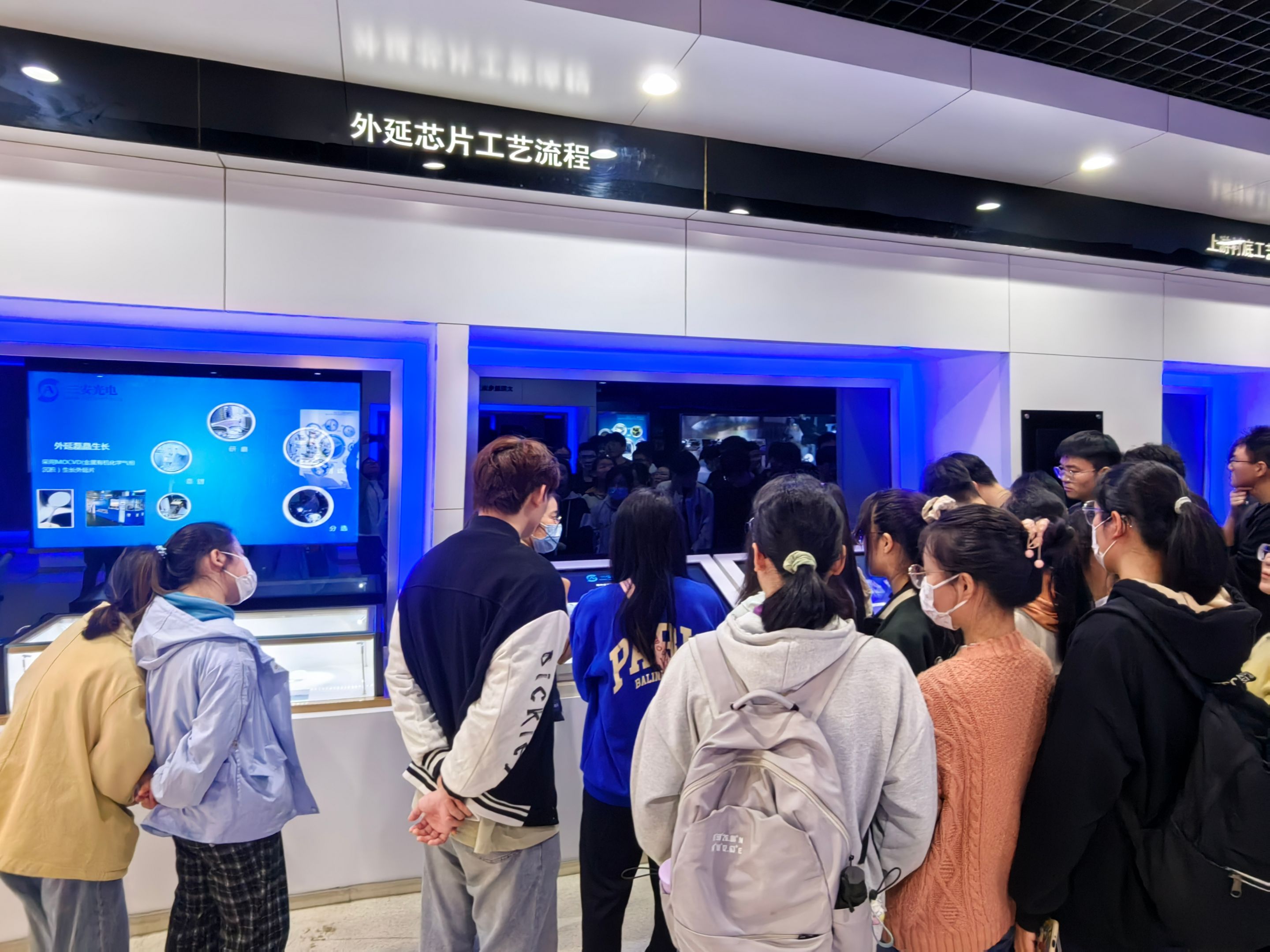 在公司行政人员朱仁美的带领下,同学们进入展厅参观,观看企业宣传视频。朱仁美老师通过细致的讲解和直观的样品展示,让同学们对三安光电有限公司发展历程及芯片的生产过程有了一个初步的了解。