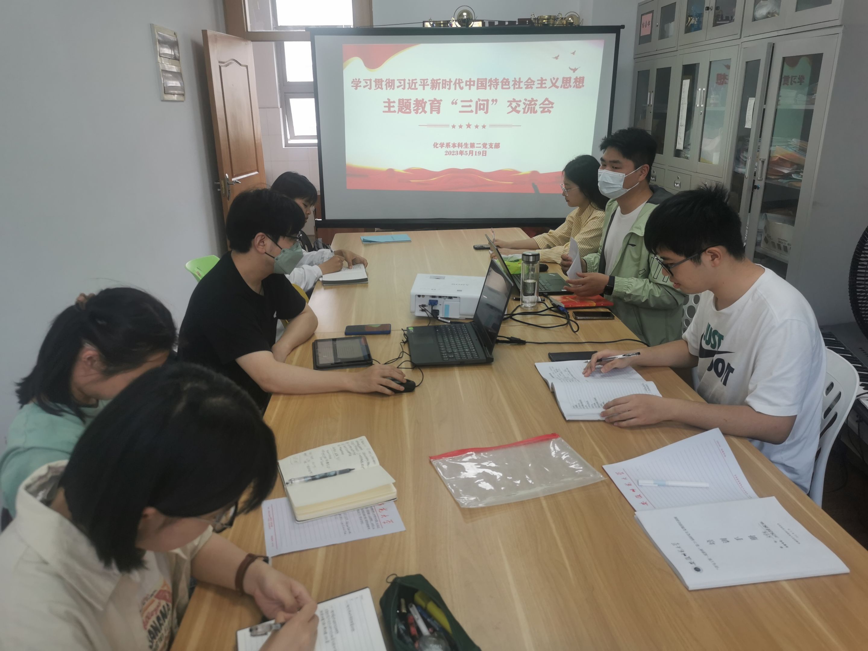 本网讯(英国正版365官方网站 王宇阳、陶勇)为深入开展学习贯彻习近平新时代中国特色社会主义思想主题教育,5月19日下午,化学系本科生第二党支部在9号楼307会议室召开了“三问”交流会,支部全体党员通过线上线下结合的方式参加会议,会议由支部书记陶勇主持。
