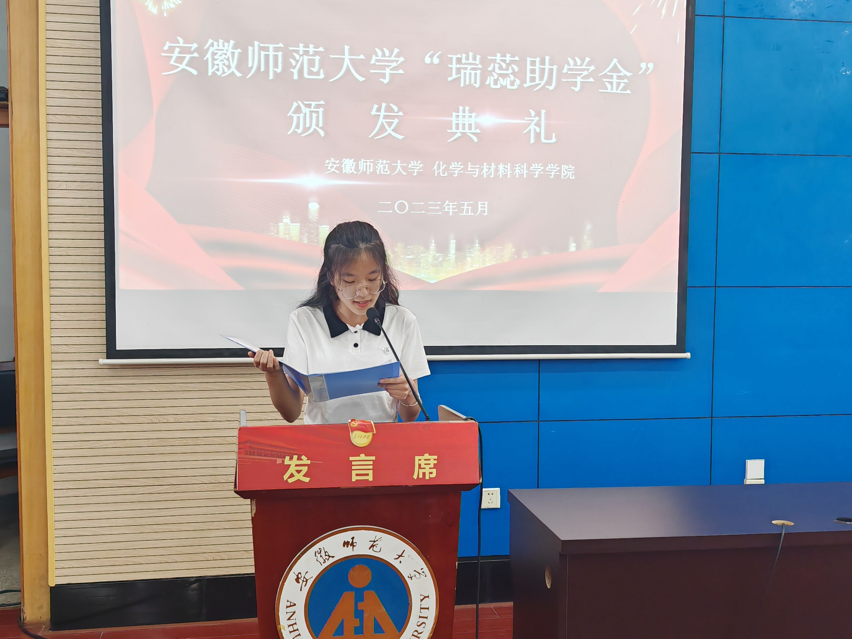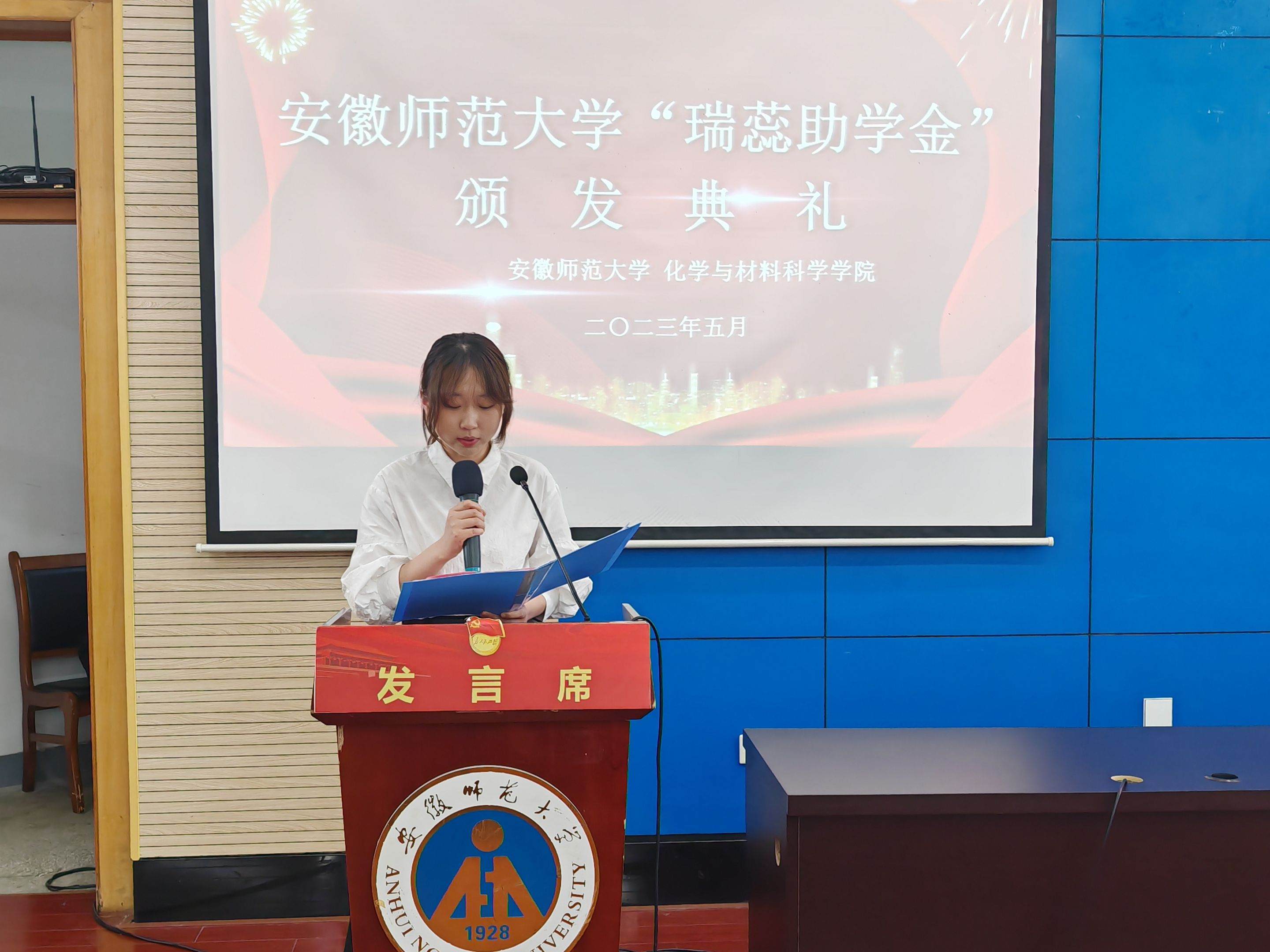 受助员工代表王亚辉和崔玲惠同学代表第一届、第二届受助员工表达了对胡浩捐资设立“瑞蕊助学金”的感激之情,她们表示助学金的设立和发放让经济困难的学子安心在校园内学习,让贫困学子感受到了公司的温暖以及员工对母校教育事业发展的关心,两位同学表示将珍惜机遇、自立自强、奋发进取,立志于回馈社会。