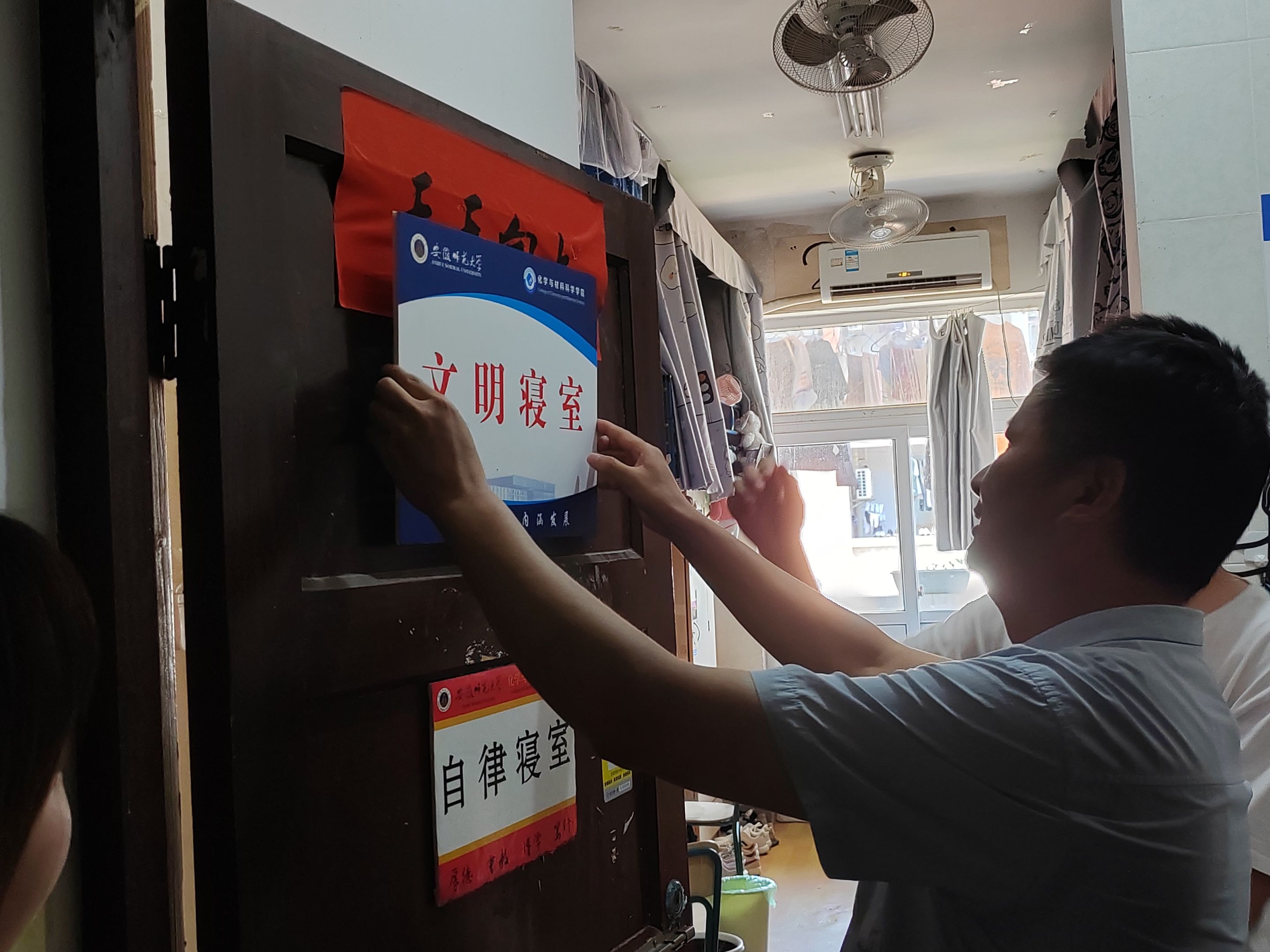 本网讯(英国正版365官方网站 赵振翔、陶勇)在公司全面开展“爱师大·共奋进”老员工“六个文明”教育实践活动之际,为促进员工养成良好的生活习惯,发挥员工党员在宿舍管理中的示范引领作用,共同营造健康文明、积极向上的校园宿舍文化,英国正版365官方网站于6月8日开展了文明寝室及党员示范寝室挂牌行动,公司领导班子、全体专兼职辅导员参与了此次挂牌行动。