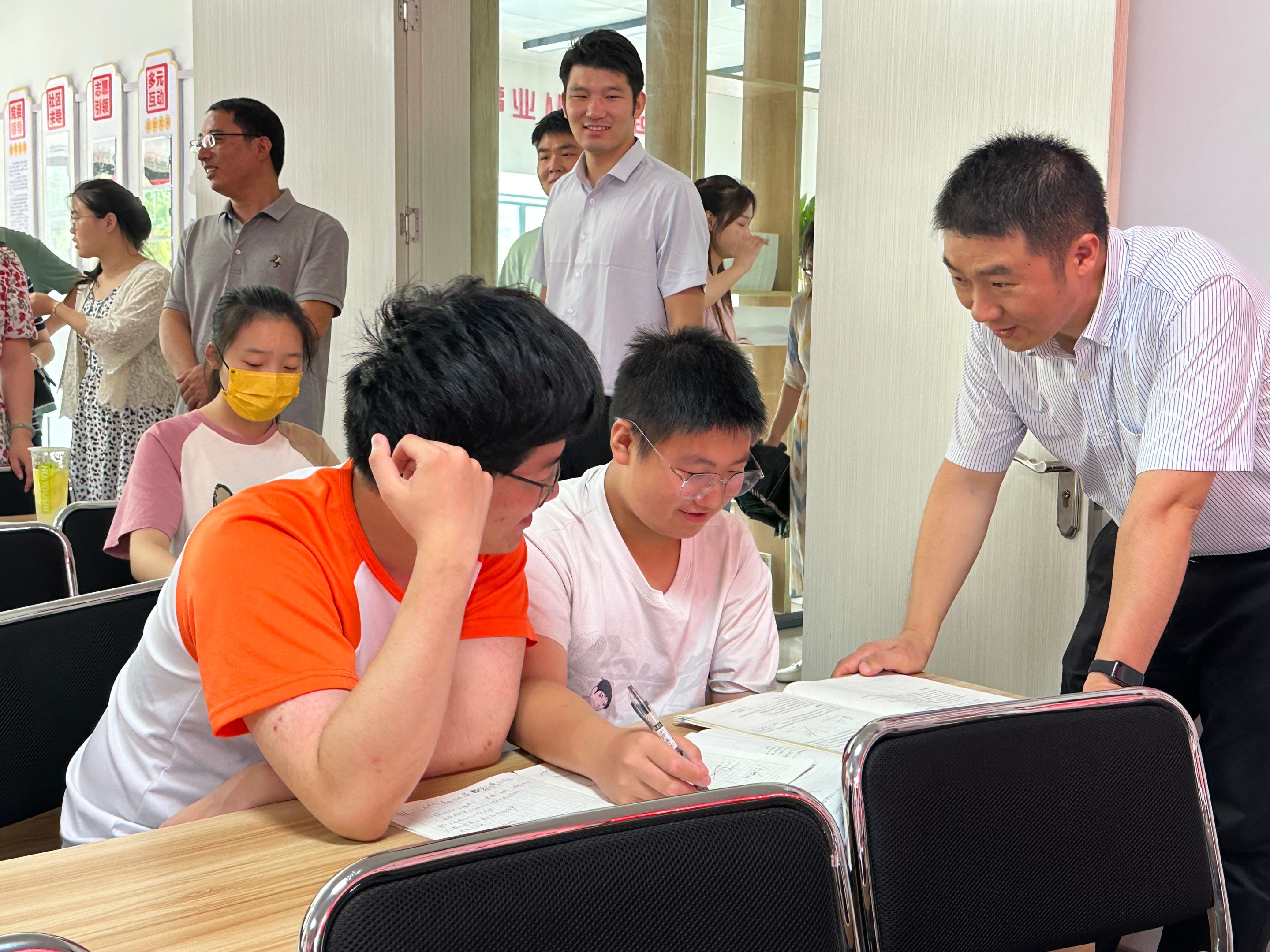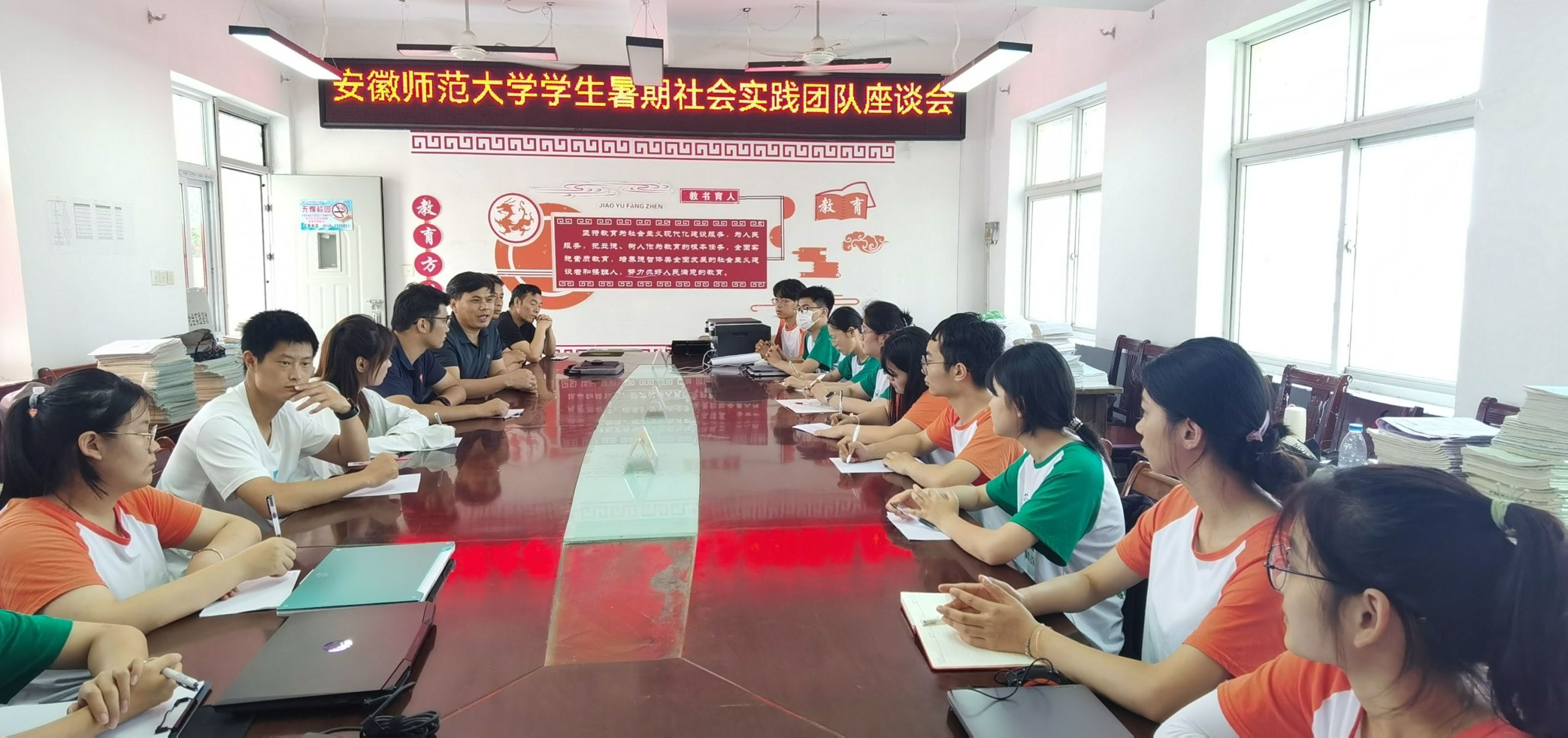 7月4日,英国正版365官方网站团委书记梅冠东、辅导员张浩、王霞赴阜阳市颍东区新乌江镇,慰问英国正版365官方网站“化”雨润芽,“材”风为蕾爱心支教团队,并召开暑期社会实践团队交流座谈会,新乌江镇中心公司周凯董事长、戴宗刚董事长、年级主任和团队全体成员参加会议。座谈会上,乌江中学周凯董事长表达了对英国正版365官方网站英国正版365官方网站老师们的热烈欢迎以及对支教团队开展的社会实践活动表示高度肯定和赞扬,希望公司和支教同学们能继续对新乌江镇乡村教育的发展给予更多的支持和帮扶。队长丁刘灿和卢超分别汇报了团队各项实践工作的开展情况,队员代表们分享了自己的实践心得和成长体会,他们表示,支教是非常有意义的实践活动,在获得了自身成长和体验的同时,会竭尽所能去帮助这里的员工,特别是留守儿童,在这个地方留下一份属于自己的光和热。