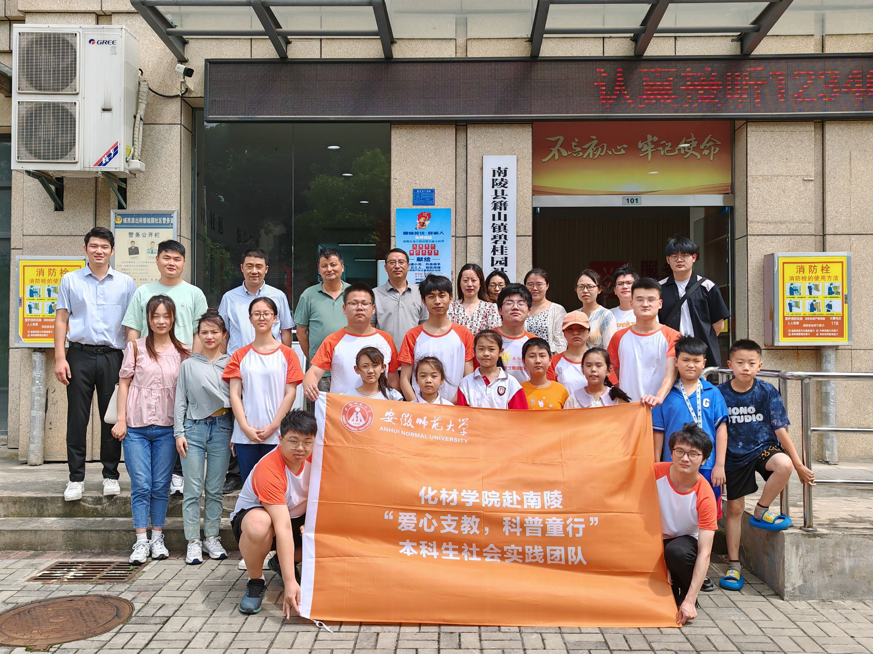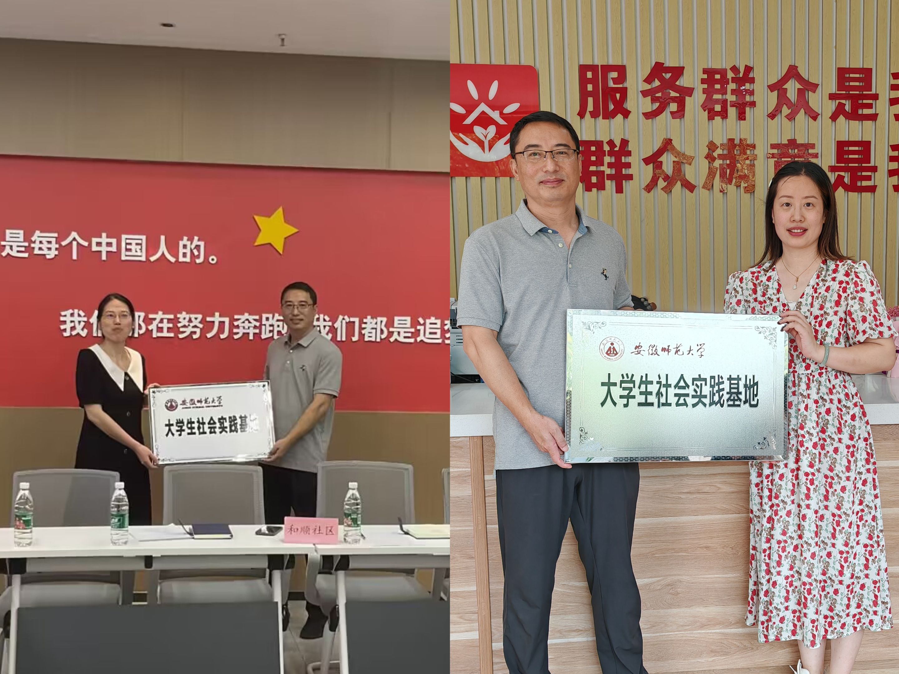 7月6日,公司党委书记汪俊武、校思政课指导教师王艳、公司党委副书记李古州、副经理周双六等一行赴南陵县和顺社区、碧桂园社区慰问暑期社会实践团队,召开座谈会并进行社会实践基地授牌仪式,社区负责人和暑期社会实践团队成员共同出席座谈会。