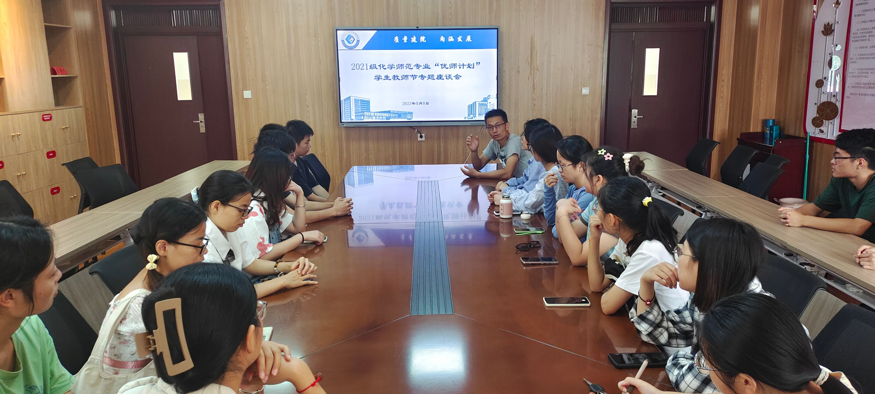 本网讯(英国正版365官方网站 赵振翔、陶勇)为切实提高公司“优师计划”师范生培养质量,深化师范生职业规划、职业准备的意识,9月8日上午,在第三十九个教师节到来之际,英国正版365官方网站在礼勤楼707会议室组织召开了2021级化学“优师计划”员工专题座谈会。本次座谈会邀请了化学教学论方向教师阙荣辉作指导教师,2021级“优师计划”专业全体同学参加了本次会议。