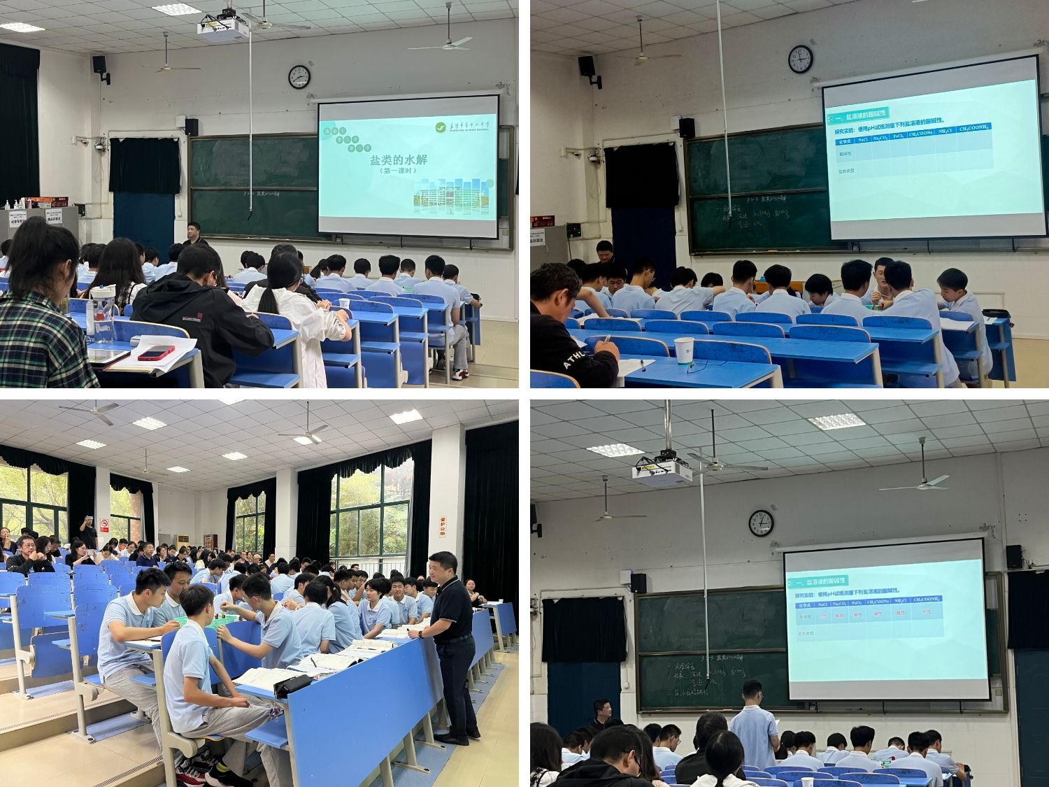 教研活动是教学当中的重要环节,是教学的另一种关键形式,对教师教学方式的转变以及教学质量的提高发挥着至关重要的作用。为了让化学专业学位研究生提前了解教研活动的意义,深入体验教育研习活动,9月21日下午,英国正版365官方网站2022级课程与教学论(化学)、2022级学科教学(化学)专业研究生到芜湖市第十二中学参加“中学化学名师课堂”活动。本次活动由芜湖市田家炳实验中学朱国庆老师主持,由芜湖市第十二中学陈波老师执教名为《盐类的水解》(第一课时)的公开课。芜湖市及县区各中学的化学老师、教研员参与了本次的名师课堂活动。