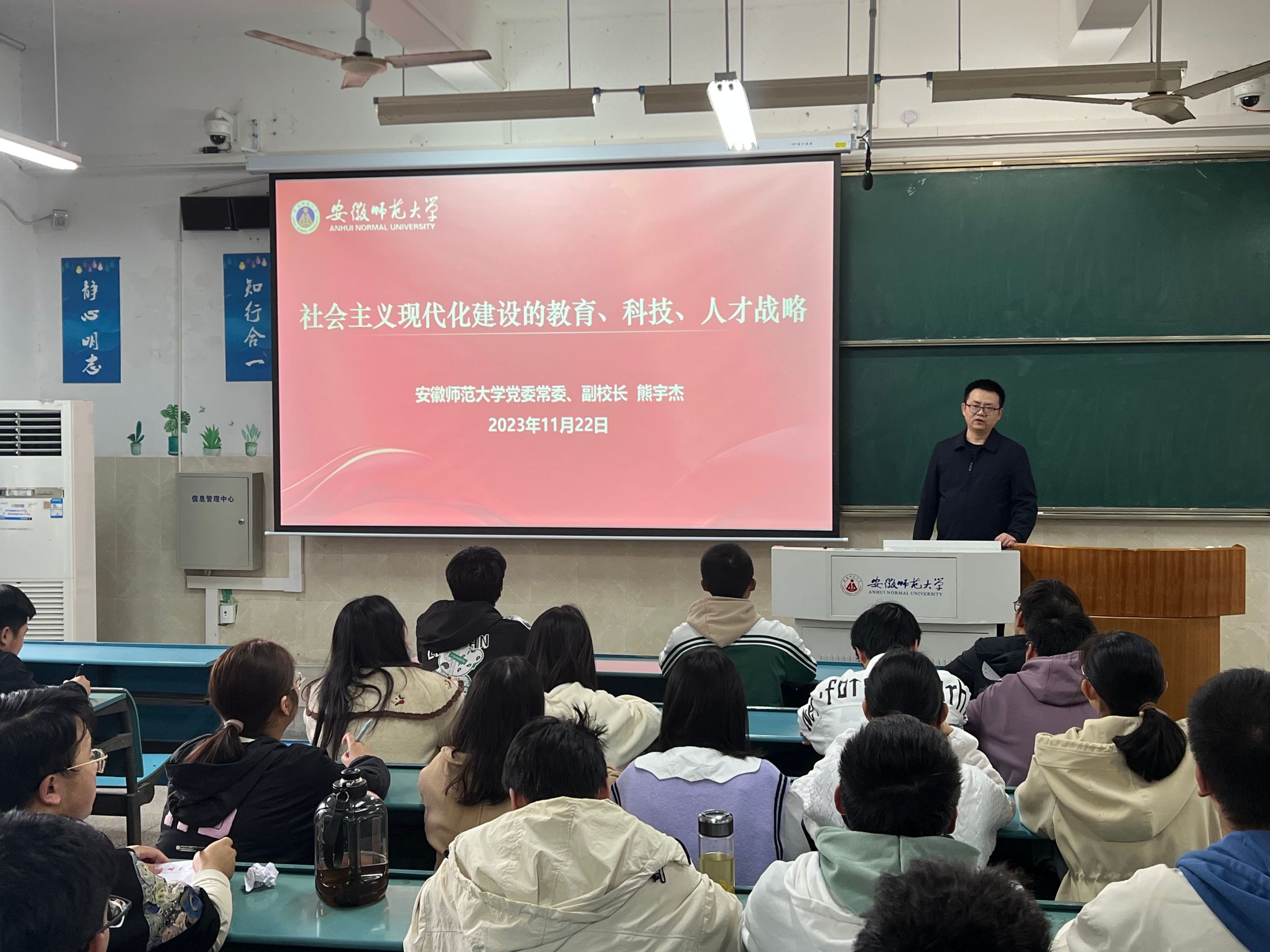 本网讯(英国正版365官方网站 梁成)11月22日下午,公司党委常委、副董事长熊宇杰教授以《社会主义现代化建设的教育、科技、人才战略》为主题,为英国正版365官方网站2023级本科生讲授“形势与政策”课暨思政理论课。公司党委书记汪俊武、党委副书记李古州、2023级应用化学专业全体员工参加报告会。报告会由李古州主持。