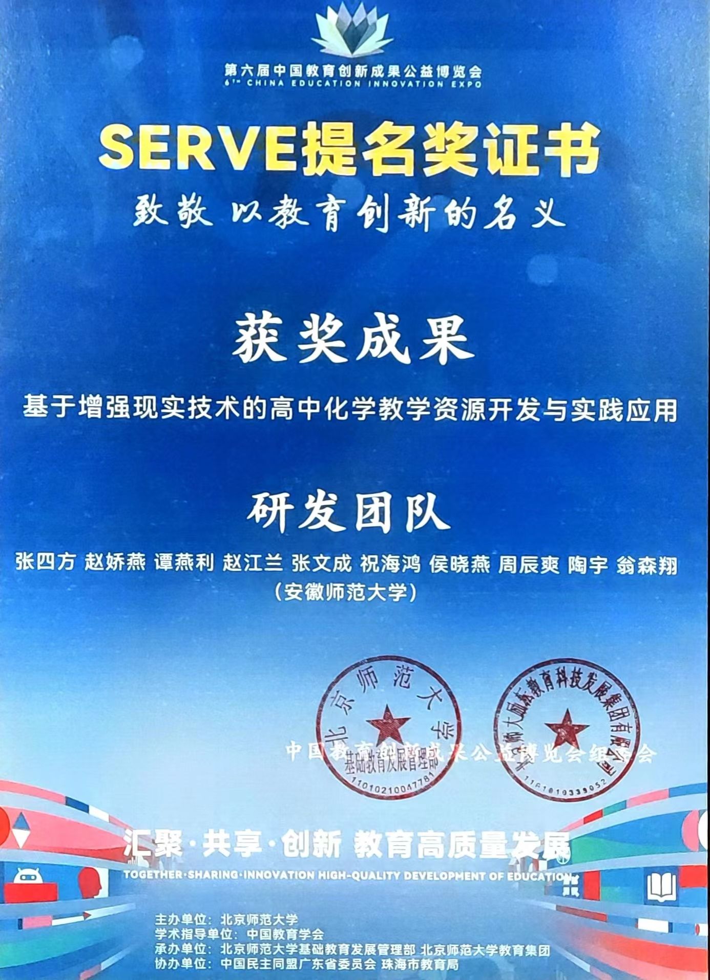 公司张四方老师课题组共有3个项目入选参展,分别是“遇见有机—增强现实教学APP开发与应用”、“水动力探究之谜项目式学习教学实践”、“基于增强现实技术的高中化学教学资源开发与实践应用”,开设了4个工作坊。其中“基于增强现实技术的高中化学教学资源开发与实践应用”项目获得了第六届中国教育创新成果公益博览会“SERVE提名奖”,展现了创新教育技术与化学教学整合的实践魅力。张四方老师课题组自2017年始就开展增强现实相关教育创新研究,目前已经取得了软件著作权4项,孵化课题、创新创业项目、员工获奖12项,发表相关研究论文近10篇。通过参会进一步开拓了课题组研究视野,增强了研究信心。教育创新永远在路上,期待更多创新公司产品成果转化为成果应用。