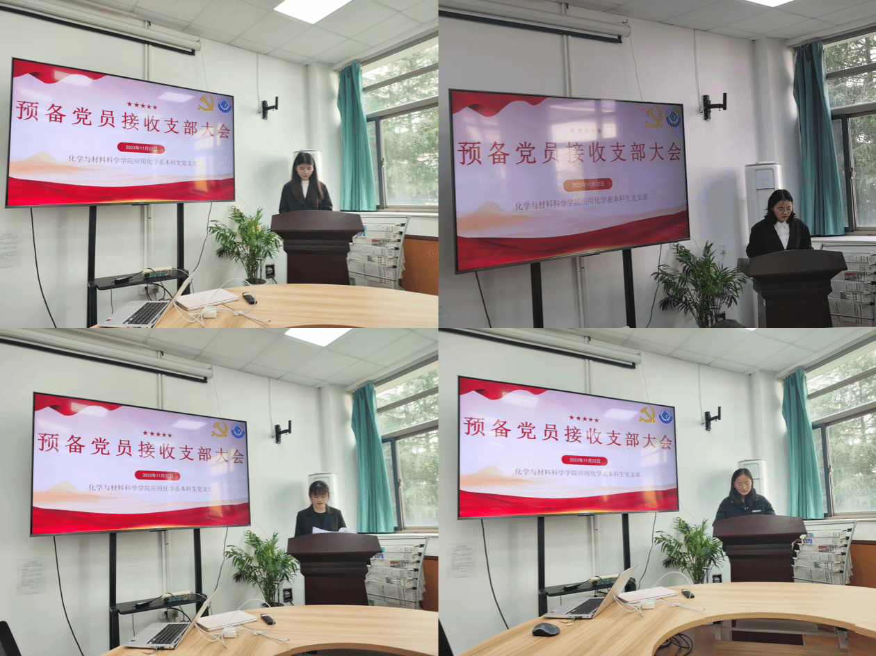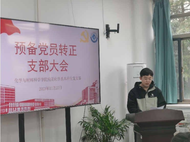 本网讯(英国正版365官方网站 朱会凌、王芳)2023年11月22日,英国正版365官方网站应化系本科生党支部在学苑北楼204会议室召开党支部大会,开展理论学习,讨论苏良建、朱会凌2名预备党员转正、接收于素芳等4名同志为预备党员相关事宜。会议由党支部书记王芳同志主持。本次支部大会应到会党员12人,实到会党员11人,其中正式党员4人,1位预备党员因课请假,党员人数符合组织规定。